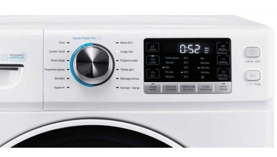 Lave-linge Frontal » Capacité : 18 kg » Vitesse d’essorage : 1000 tours/min » 12 programmes » Programmes standard: - SteamPower Pro - programme anti-allergique - hygiène PRO - nettoyage tambour - 6 programmes vapeur - prélavage - rapide - éco - soin bébé » Départ différé : 1-24h » Température : 20 °C à 90 °C » rinçage+ » Affichage : Display LED » Affichage du temps restant » Bac lessiviel amovible » Tambour : Inox alvéolé » Volume du tambour : 127,4 L » Trappe de vidange en façade » Porte non réversible