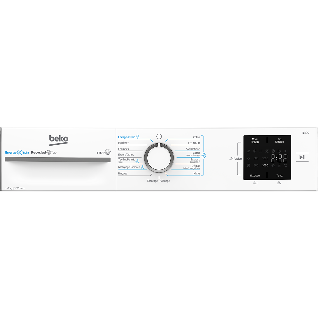 Lave-linge frontal Beko, 7 kg, 15 programmes, 1200 trs/min, technologie EnergySpin, SteamCure, tambour inox à alvéoles, afficheur digital, ajout de linge en cours de cycle, fin différée, sécurité enfants, anti-débordement, moteur à induction