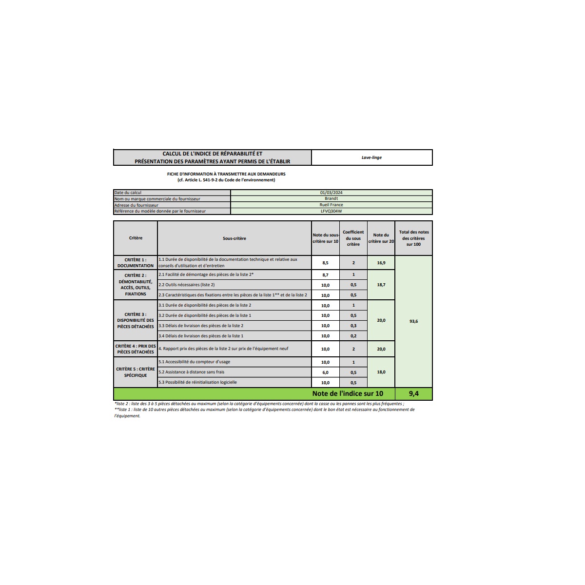 Libellé lave linge front VEDETTE LFVQ304W 10 kgs 1400 tours induction