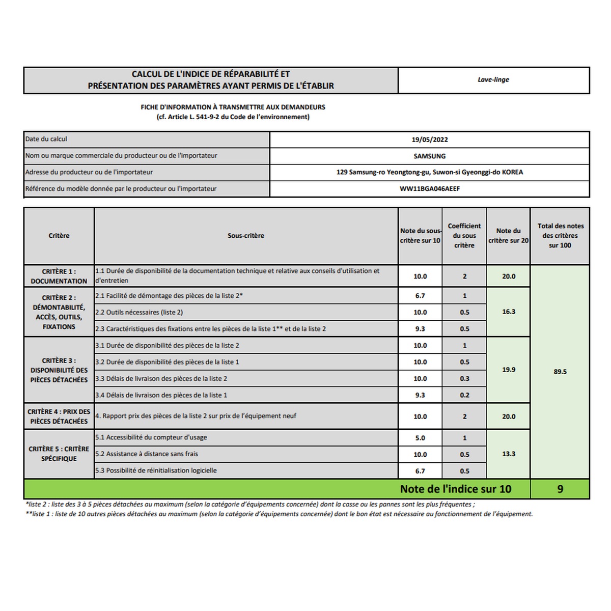 Indice de réparabilité 9 / 10