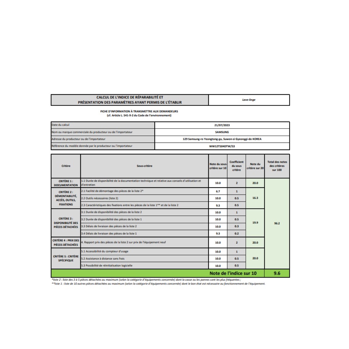 | Libellé | Lave-linge frontal 12kg 1400 tours/min - WW12T504DTW - samsung |