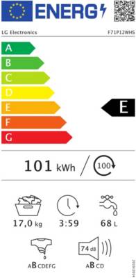 Lave-linge hublot LG F71P12WHS - Capacité : 17kg - Classe d'éfficacité énergétique 2021 : E - Fin différée 19 heures Steam™ - Lavage vapeur TurboWash™ - Lavage en 39 minutes, performance et économique 6 Motion™ DD - 6 mouvements associés pour une performance optimale Moteur Direct Drive™ - Moteur à transmission directe garanti 10 ans, fiabilité et silence Grande capacité - 17kg pour 127L de volume tambour