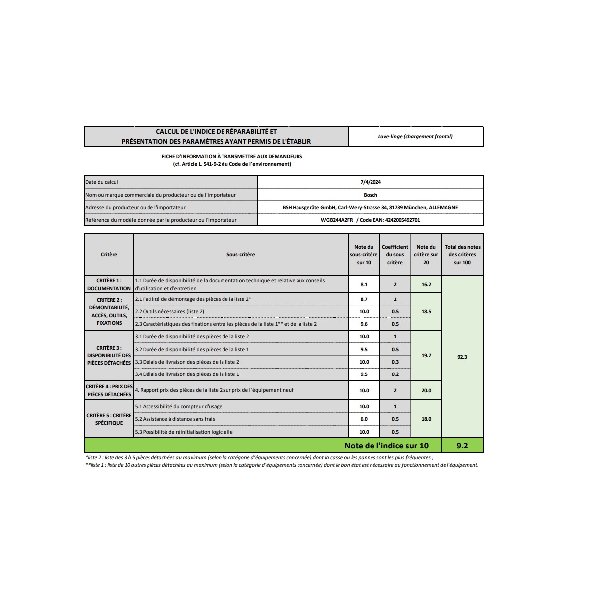 Indice de réparabilité 9,2 / 10
