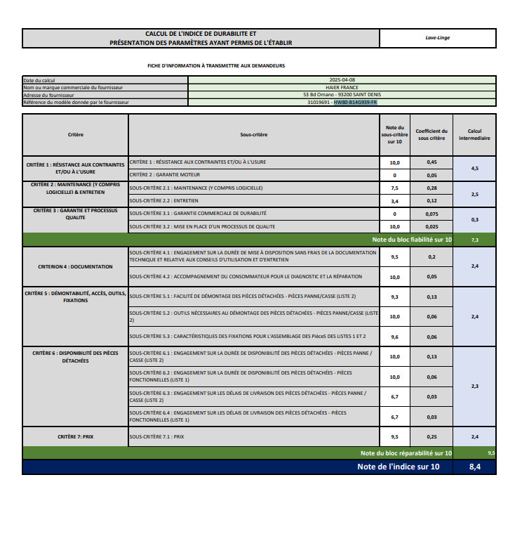 Indice de réparabilité : 8,3.
