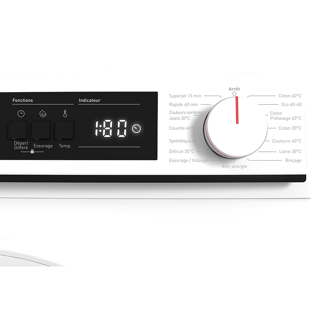 Lave linge 9kg, 1400 T, classe A, moteur induction, départ différé, cuve inox, affichage digital, fonction anti-allergie, 15 programmes, sécurité enfant, blanc