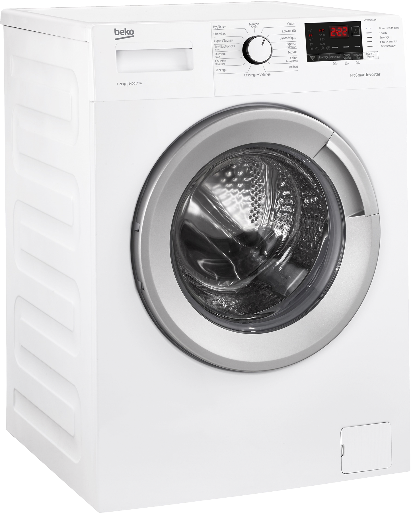 Lave-linge Frontal 9 kg, 1400 trs/mn, classe B, 15 programmes dont express 14', parois anti-vibrations, afficheur digital, tambour inox Aquawave, fin différée, sécurité enfants, ajout de linge en cours de cycle, coloris blanc