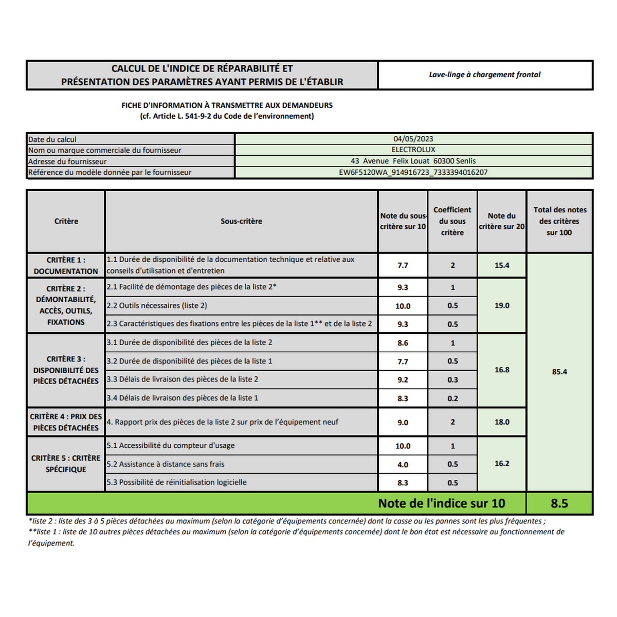 | Libellé | Lave-Linge Hublot 10 KG ELECTROLUX EW6F5120WA |