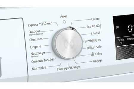 Programme de lavage : Coton froid - 90°C, Synthétiques froid - 60°C, Essorage/Vidange, Lingerie, Couleurs sombres, Chemises, Outdoor/Imperméabiliser, Mix rapide, Express 15/30 min, Nettoyage tambour, Délicat/Soie, Laine/Lavage main.
