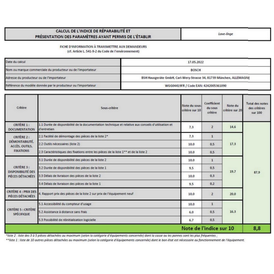 Indice de réparabilité : 8,8.