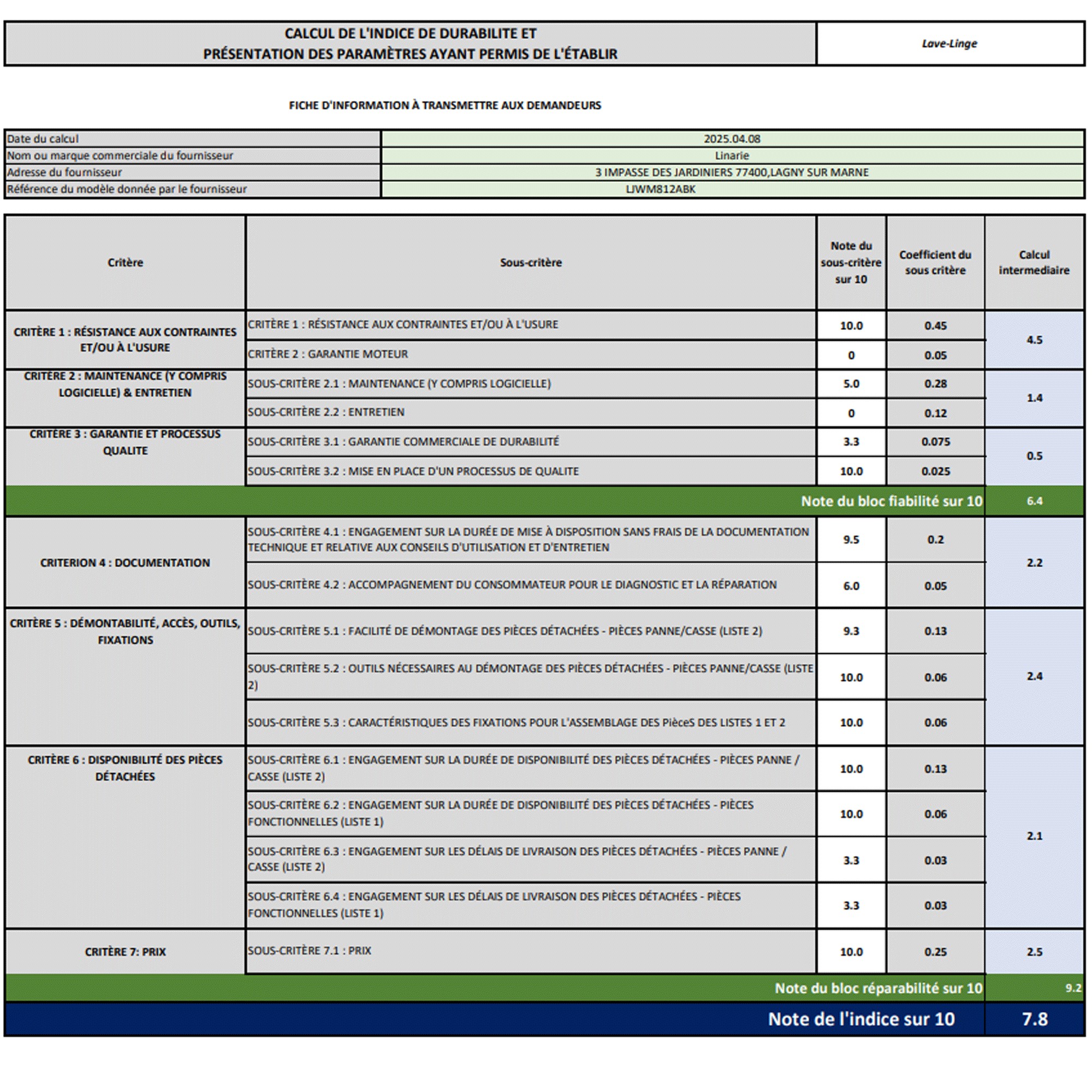 | Disponibilité des pièces détachées | 5 ans/Date d'achat |