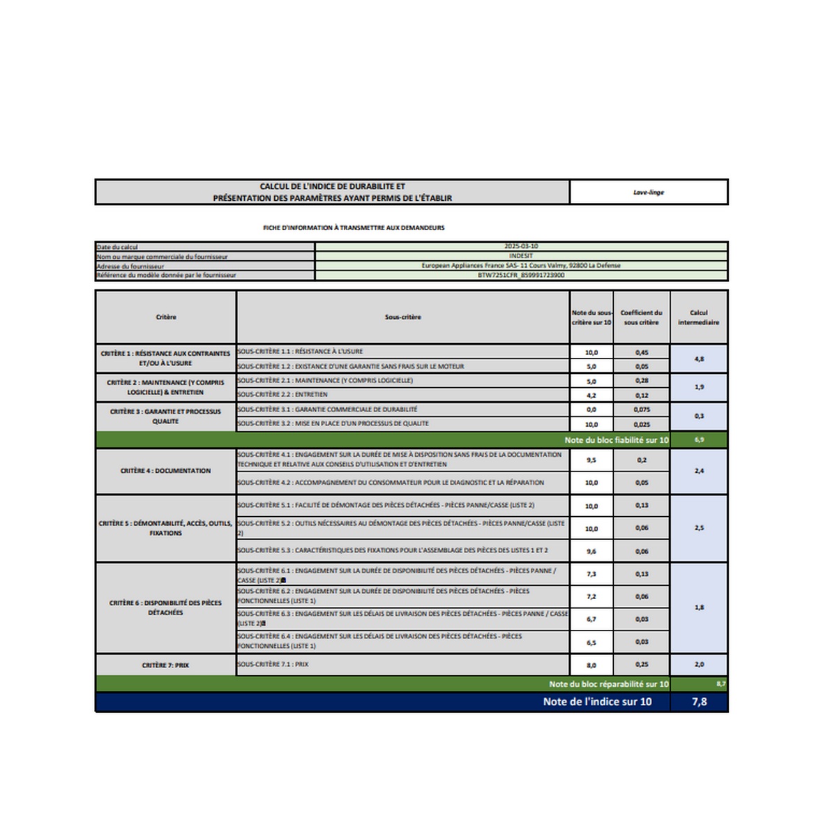 Consommation pondérée d'énergie (KWh / 100 cycles) : 52.