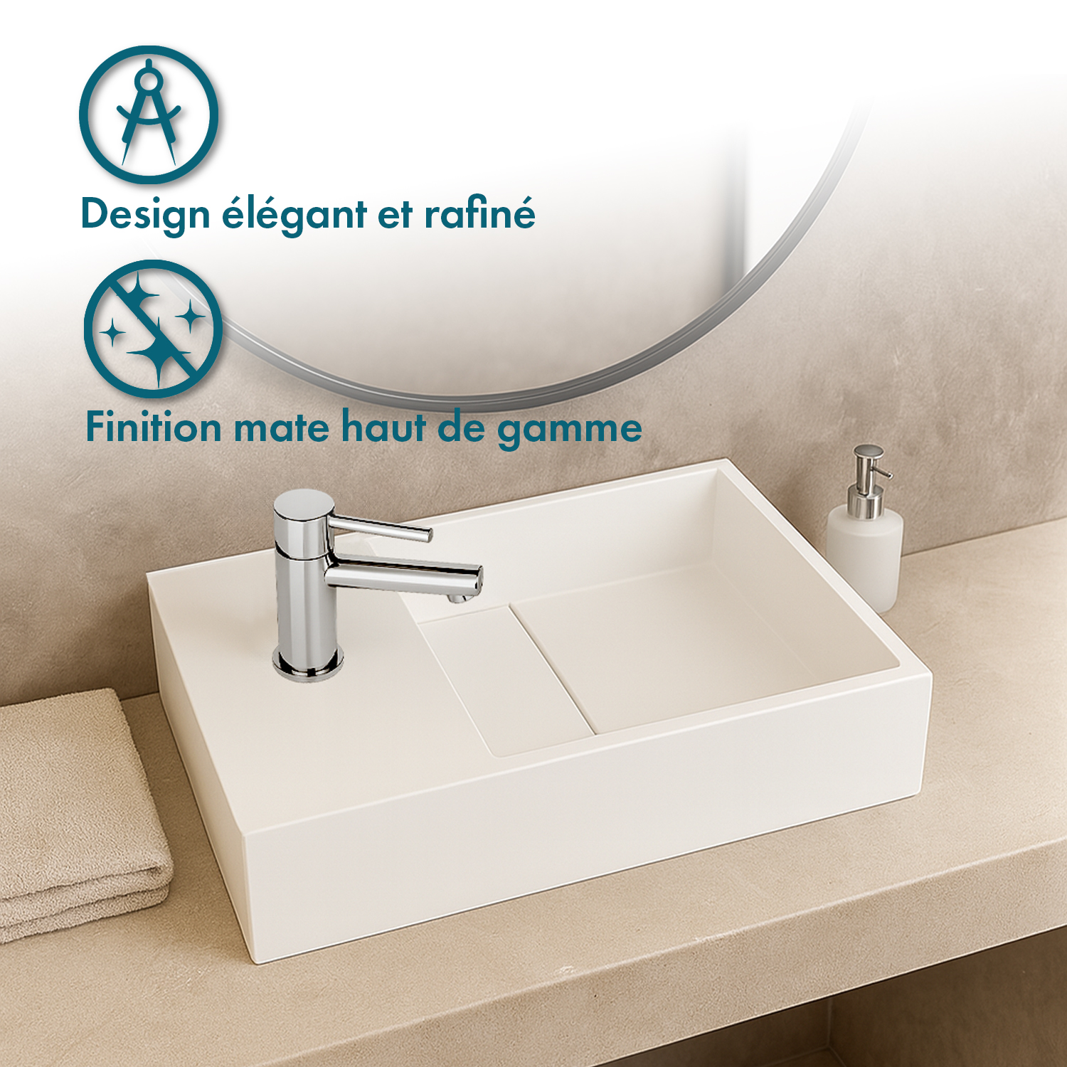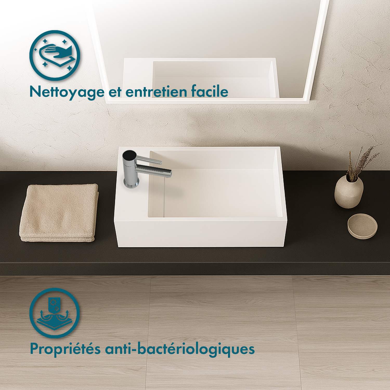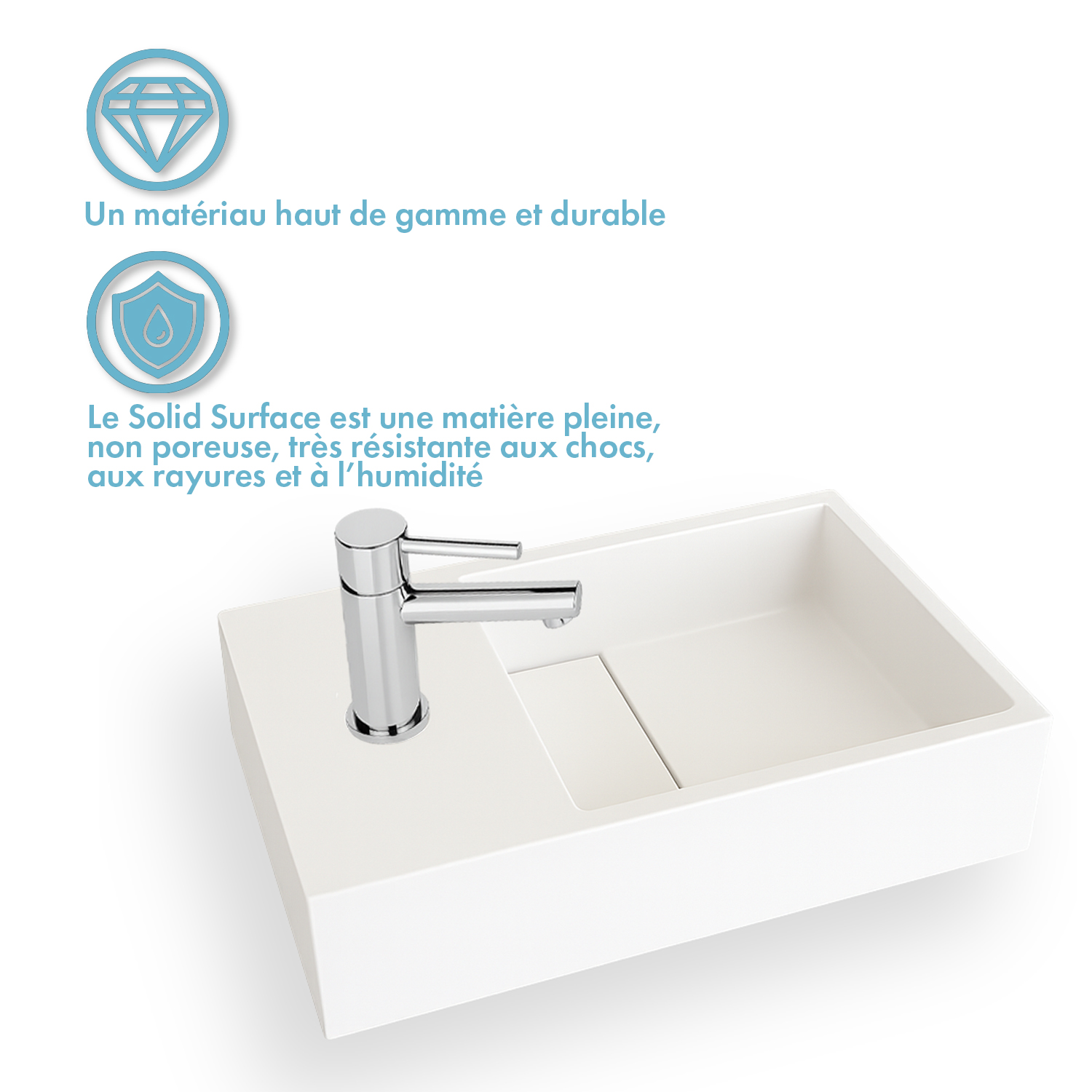 Sa matière en solid surface est réputée pour sa qualité haut de gamme. Issue d’un mélange de matières naturelles, de résine et de pigments, le solid surface est une solution durable et esthétique qui résiste parfaitement aux tâches et aux moisissures. Ce lave-mains est également facile à entretenir grâce à sa surface lisse et homogène.