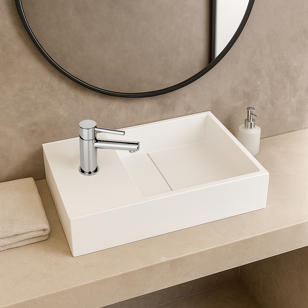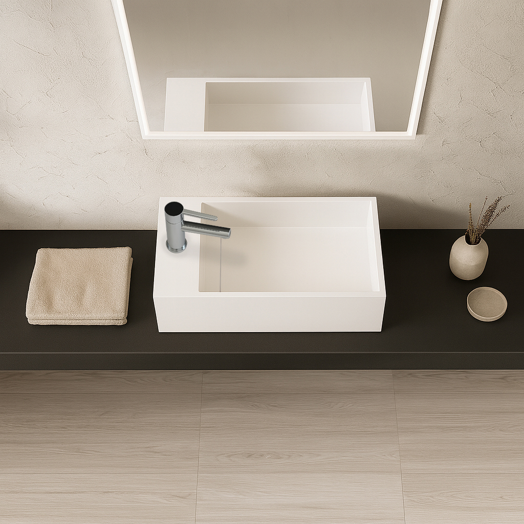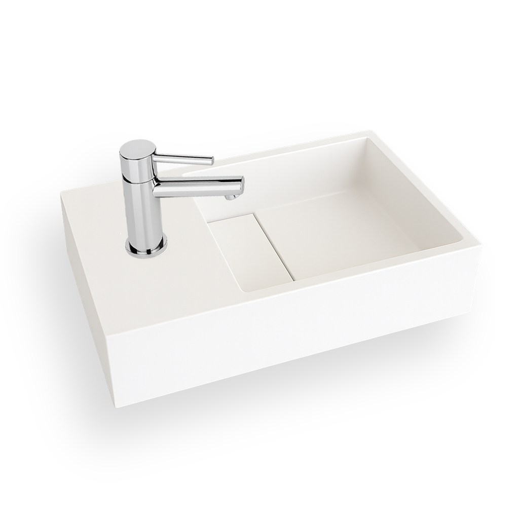 Sa matière en solid surface est réputée pour sa qualité haut de gamme. Issue d’un mélange de matières naturelles, de résine et de pigments, le solid surface est une solution durable et esthétique qui résiste parfaitement aux tâches et aux moisissures. Ce lave-mains est également facile à entretenir grâce à sa surface lisse et homogène.