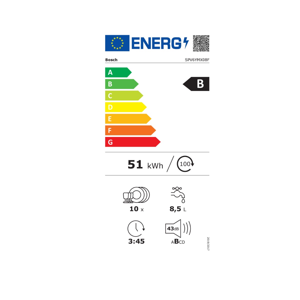 SPV6YMX08F - lave-vaisselle 45cm 10 couverts 43db tout intégrable - Le lave-vaiselle série 6 de Bosch SPV6YMX08F, tout intégrable est équipé du système Rackmatic pour le panier supérieur, ajustable en hauteur jusqu'à 5 centimètres sur 3 positions différentes, même complètement chargé. Il dispose d'une capacité de 10 couverts et il est silencieux grâce à son niveau sonore de 43 décibels. Il comprend 6 programmes : eco 50 °C, auto 45-65 °C, intensif 70 °C, Quotidien 60 °C, Silence 50 °C, et Favourite (Pré-rinçage) et 4 options : Home Connect, Séchage extra, Zone Intensive, SpeedPerfect+ (3 fois plus rapide). Vous profitez de la fonction départ différé pour faire démarrer automatiquement votre lave-vaisselle au meilleur moment et réaliser ainsi des économies. Grâce à Home connect, cet appareil est doté d'une connectivité intelligente, qui vous assure une vie quotidienne plus facile. Lave-vaisselle PerfectDry : des résultats de séchage parfaits avec des solutions de chargement flexibles et pratiques pour ranger vos différents types de vaisselle.