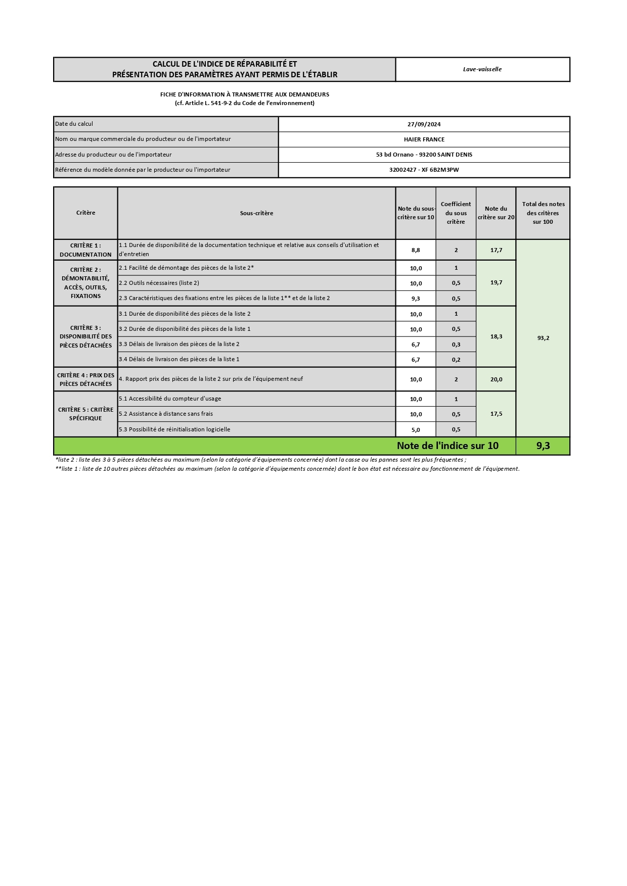 | Consommation d’énergie pour 100 cycles (kwh) | 66 |