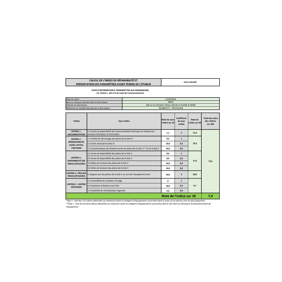 Indice de réparabilité 7,9 / 10