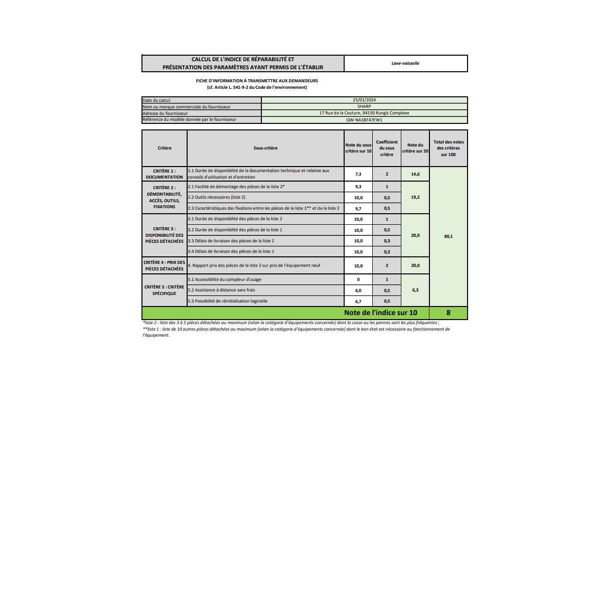 Indice de réparabilité (Note /10) : 8.
