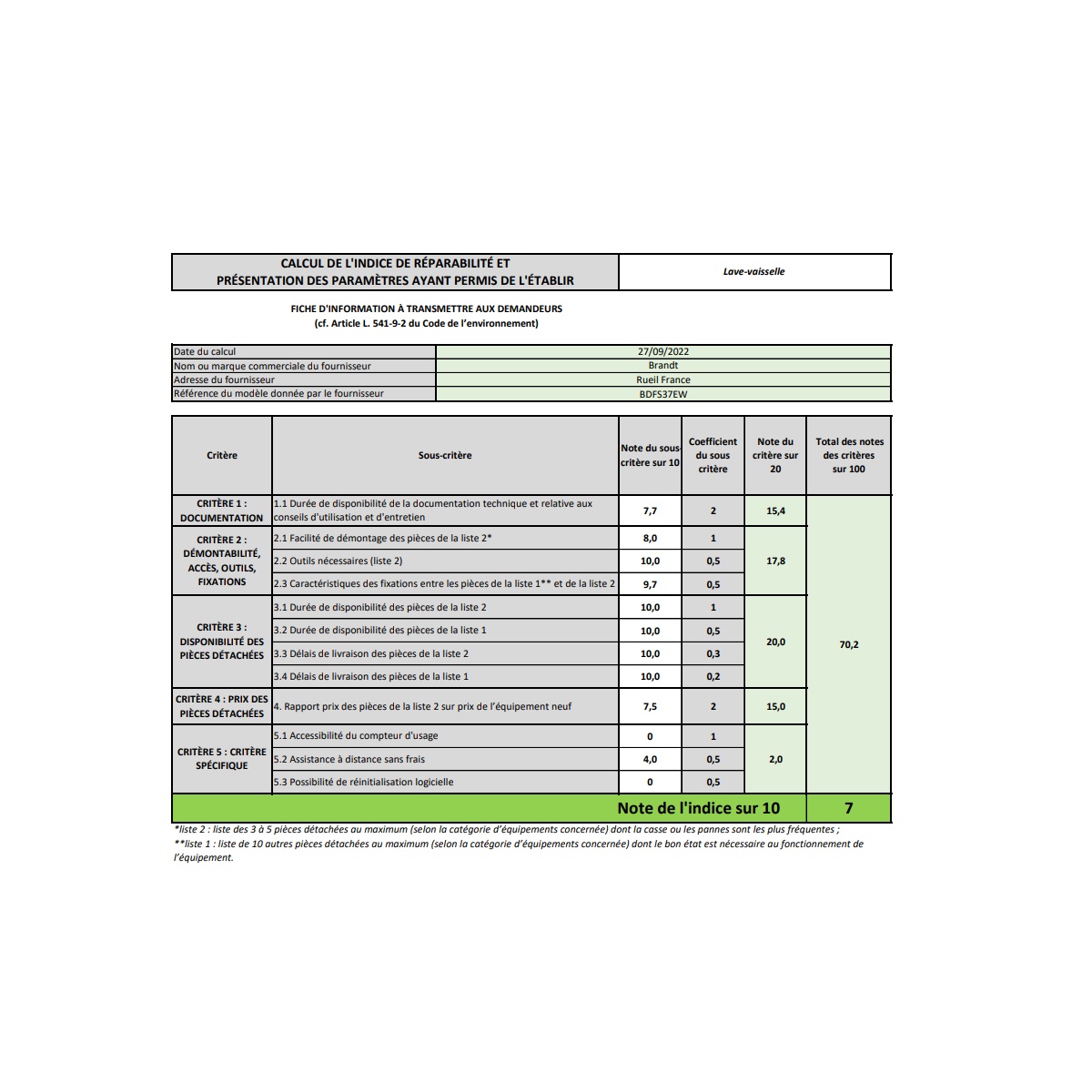 | Libellé | lave vaisselle BDFS37EW BRANDT 13 couverts |