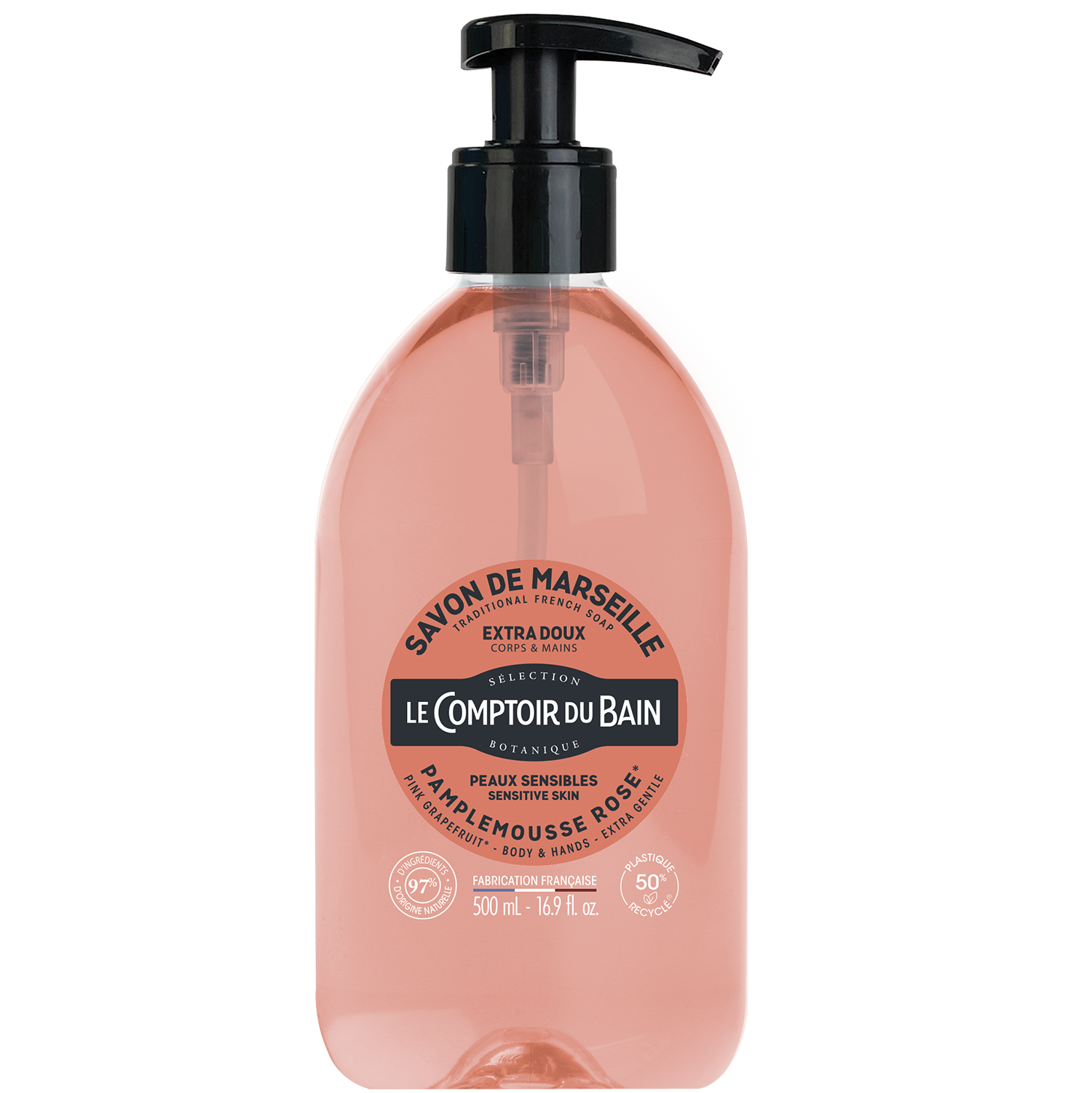 Composé de 97% d'ingrédients d'origine naturelle, le savon liquide de Marseille parfum Pamplemousse Rose nettoie efficacement le corps et les mains tout en respectant la peau. Sa formule sans huile de palme, enrichie en huile d’olive, actif protecteur, laisse la peau douce et souple après usage. Parfum pamplemousse rose aux notes acidulées. Convient aux peaux sensibles et à un usage répété tout au long de la journée. Appliquer sur la peau humide, faire mousser puis rincer. Testé sous contrôle dermatologique.