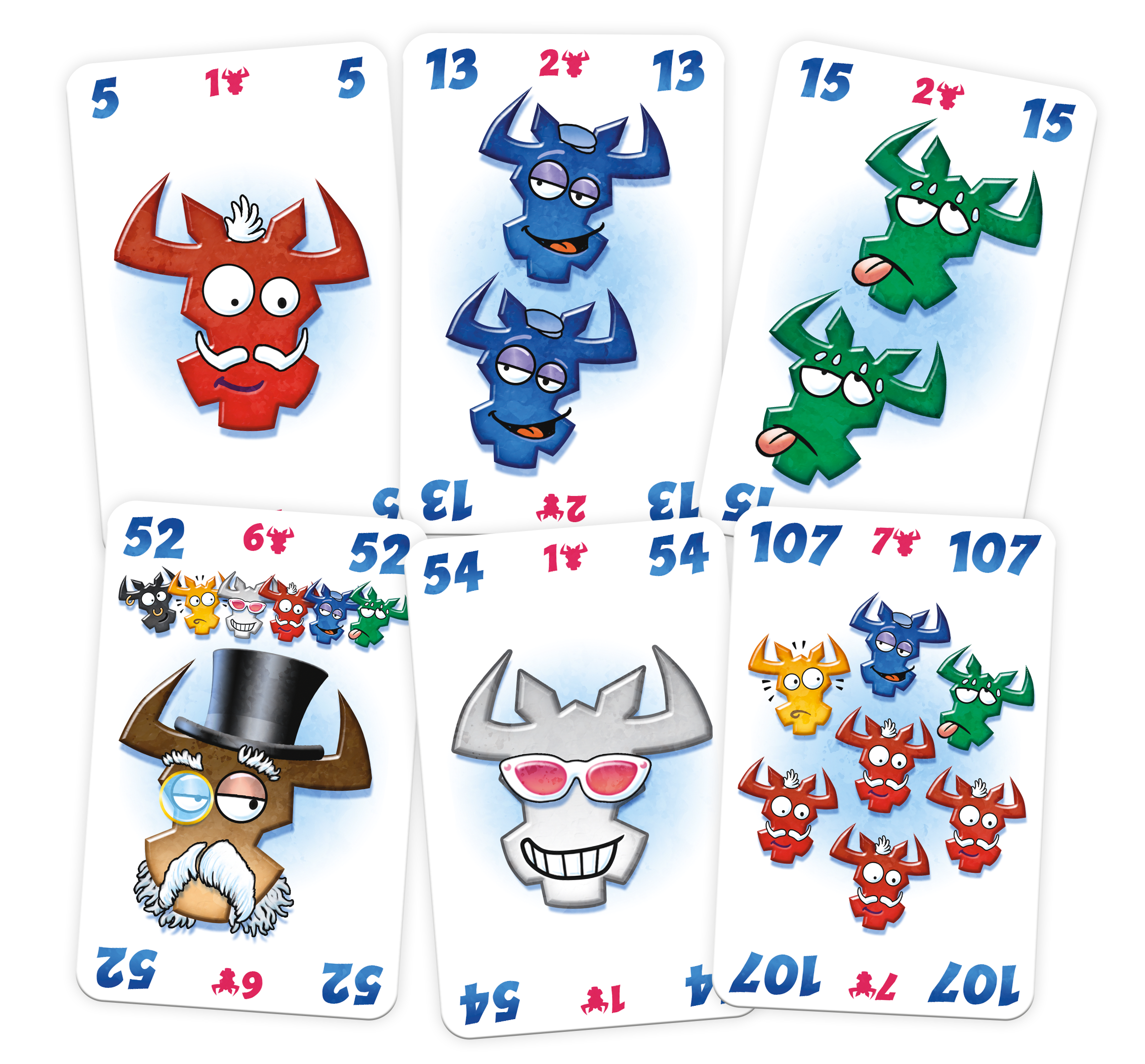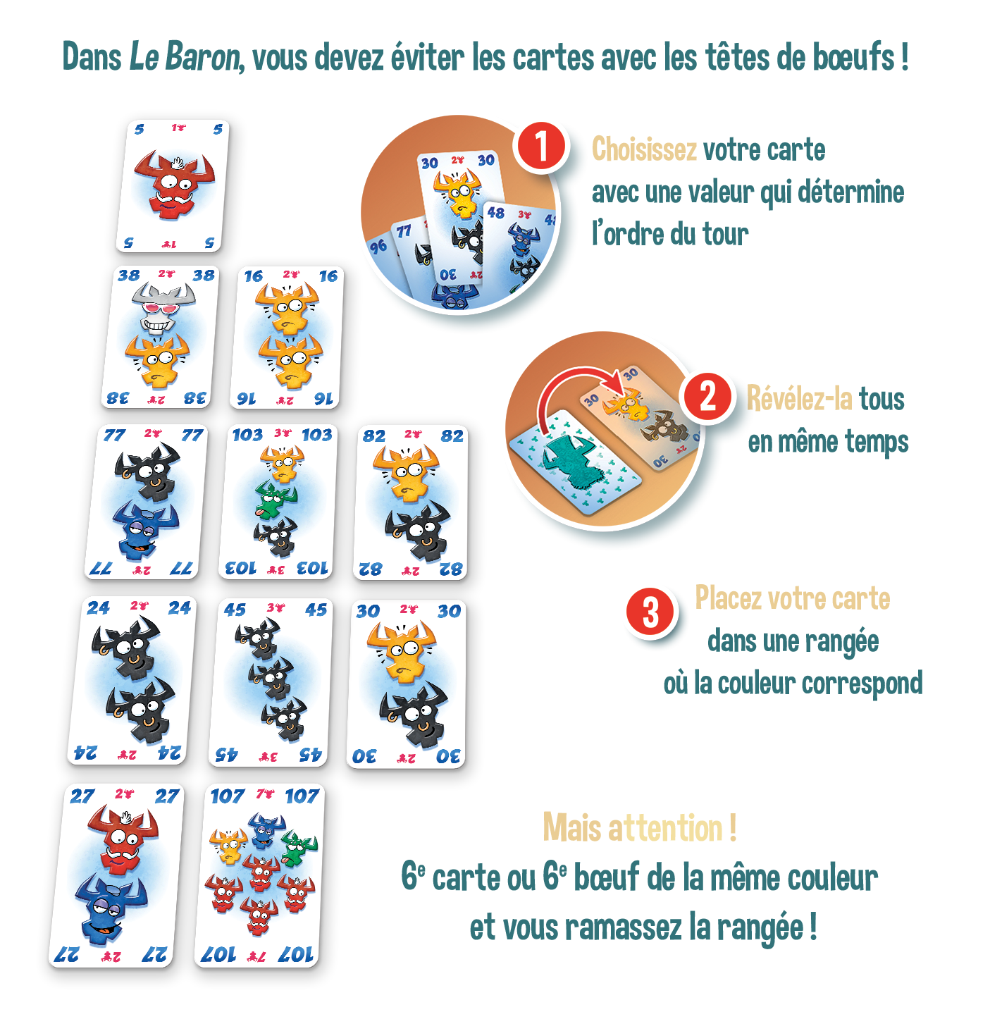 Mais attention : si vous posez la 6e carte ou la 6e tête de bœuf de la même couleur d’une rangée, vous devez ramasser les cartes ! Vous récupérez ainsi des points négatifs.
