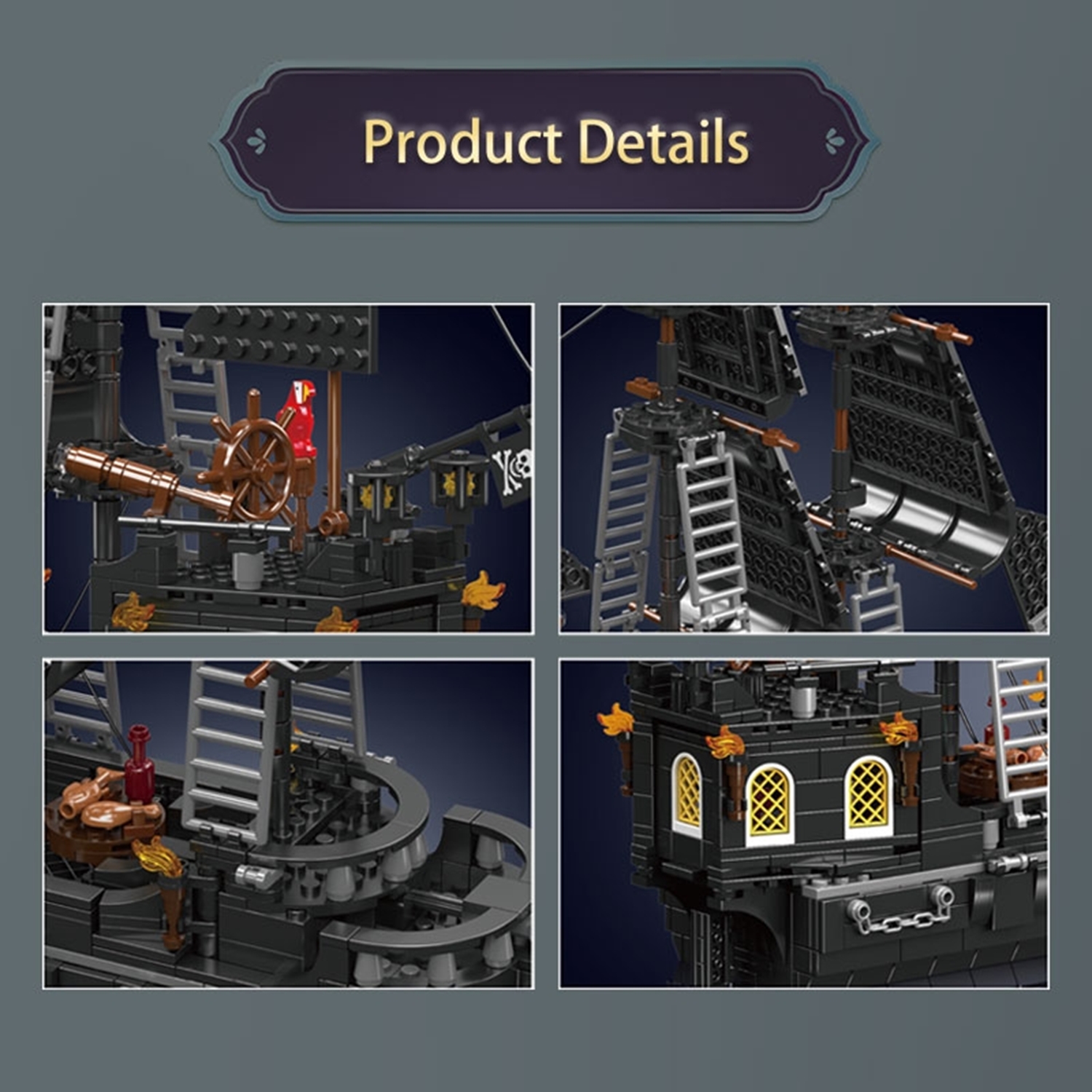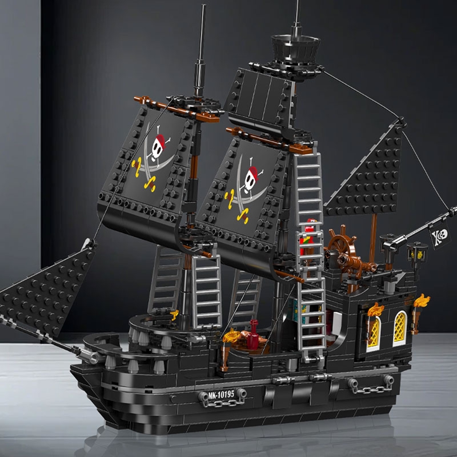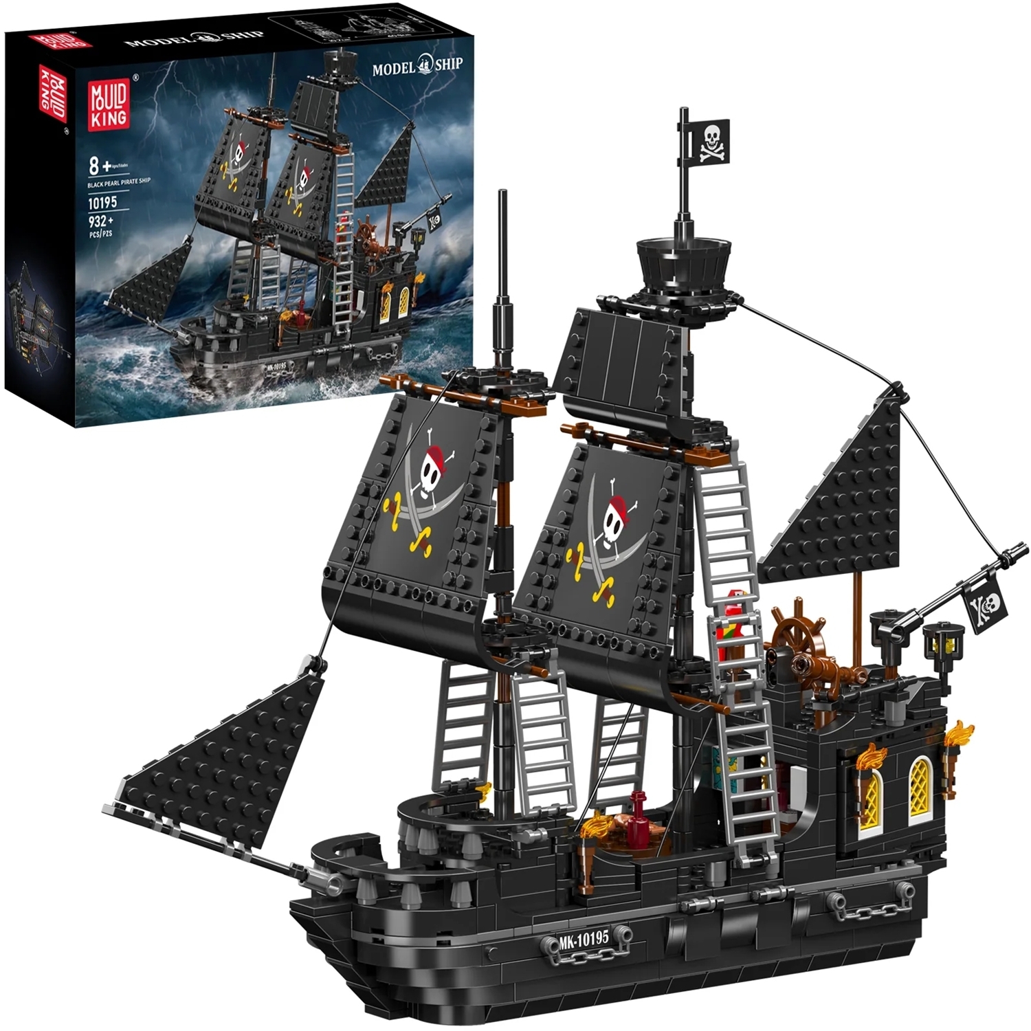 Mould King 10195 Le bateau pirate Black Pearl III - - Un sombre bateau pirate avec des voiles noires impressionnantes et un gréement richement détaillé qui semble immédiatement prêt pour l'aventure. Sur les ponts, des canons rotatifs, des échelles d'escalade et un pont de capitaine cohérent avec une roue de gouvernail et un télescope vous attendent, parfaits pour des manœuvres audacieuses. À l'arrière, les fenêtres cintrées, les lanternes et l'aspect général robuste créent une atmosphère authentique, tandis que les fenêtres jaunes scintillantes de la cabine donnent l'impression d'un intérieur éclairé. De petits accessoires tels qu'un perroquet, des tonneaux et d'autres détails d'équipement donnent vie au modèle, qui peut également servir de pièce d'exposition. - - - 932 pièces - Dimensions : environ 40,9 x 10,7 x 31,8 cm - Détails : voiles noires avec imprimé tête de mort - Fonctions : canons rotatifs montés sur le côté - À partir de : 8 ans