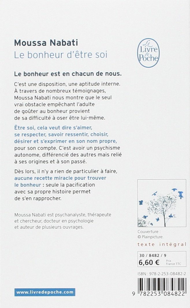 À travers de nombreux témoignages, Moussa Nabati nous montre que le seul vrai obstacle empêchant l’adulte de goûter au bonheur provient de sa difficulté à oser être lui-même. Être soi, cela veut dire s’aimer,se respecter, savoir ressentir, choisir, désirer et s’exprimer en son nom propre, pour son compte. C’est avoir un psychisme autonome, différencié des autres mais relié à ses origines et à son passé.