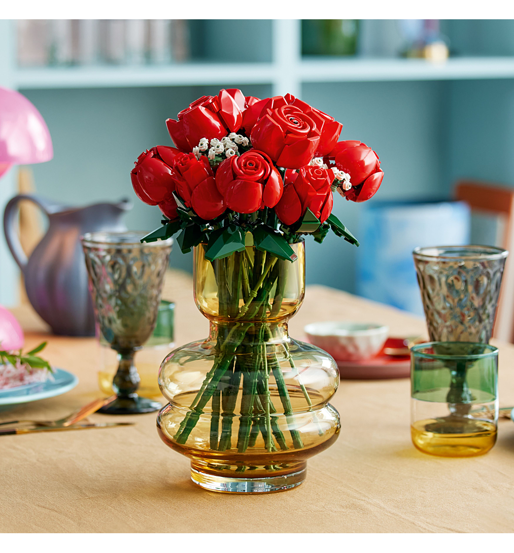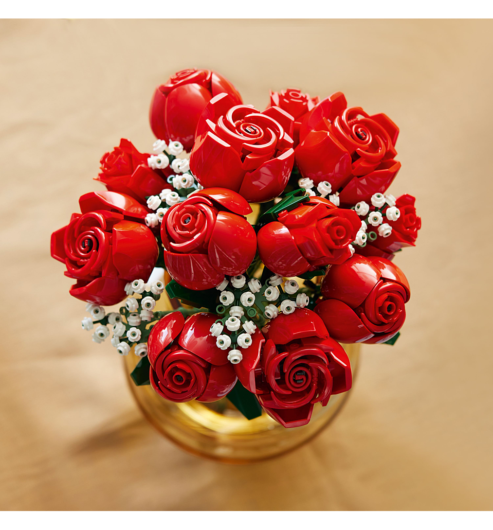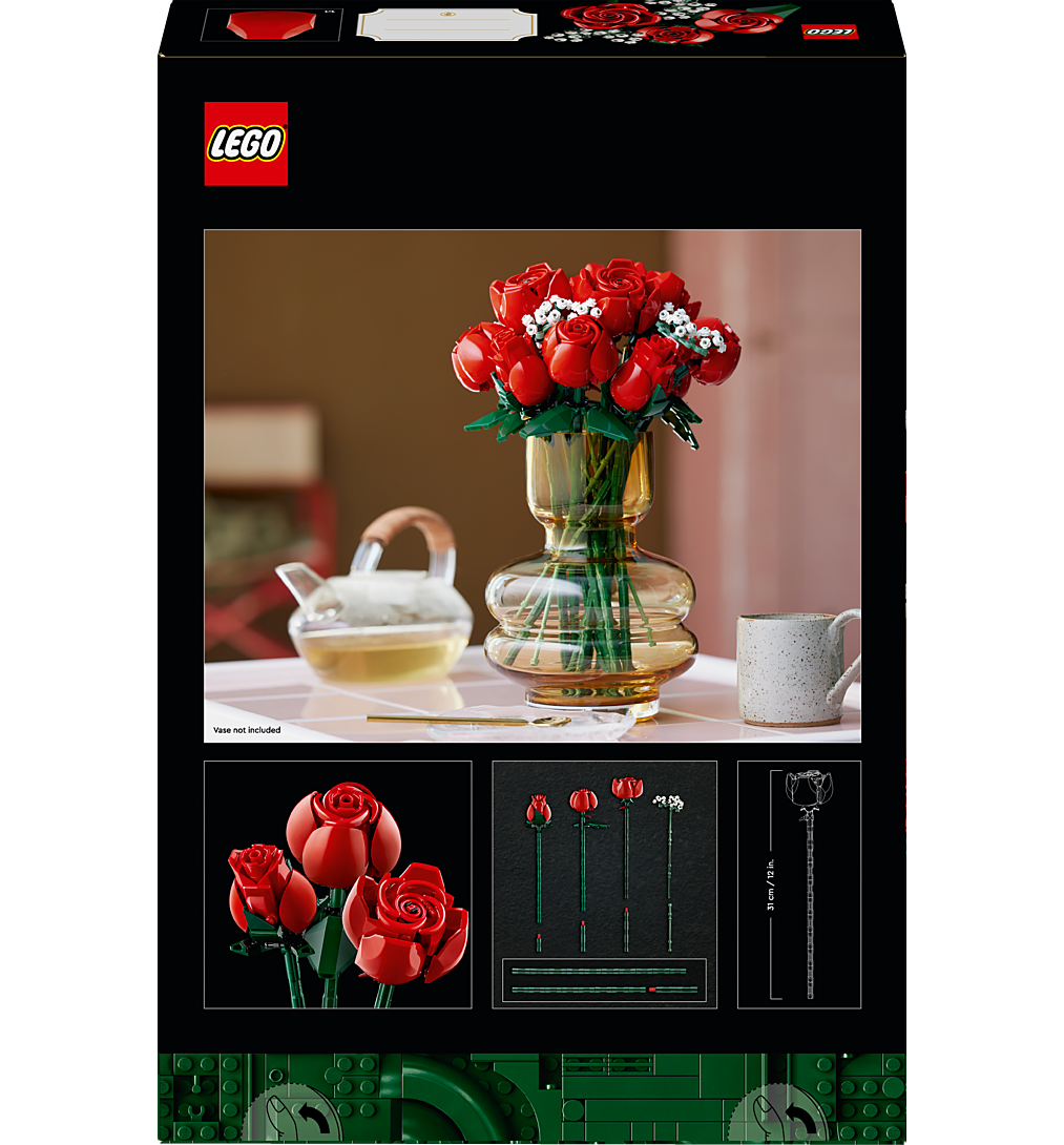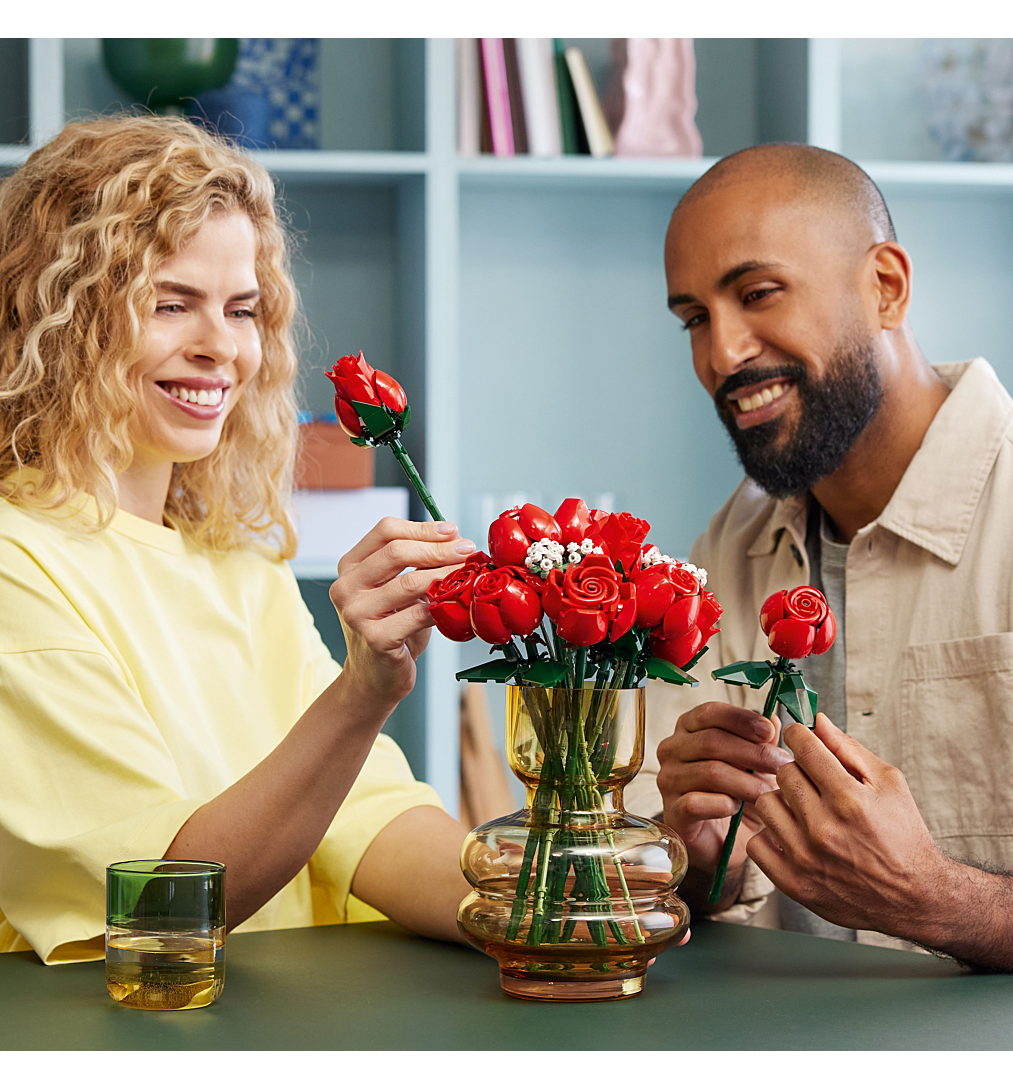 Prenez une pause et assemblez Le Bouquet de Roses LEGO Icons (10328). Ce set LEGO Botanical pour adultes constitue un projet de construction où l'attention est à son comble et vous permet de créer une décoration fascinante pour une chambre. Ce bouquet de roses LEGO offre un plaisir de construction immense et représente douze roses rouges à différents stades de floraison (4 roses en pleine floraison, 4 à moitié ouvertes et 4 bourgeons). Grâce aux longues tiges vertes, vous pouvez facilement les présenter dans un vase. Quatre branches de gypsophile avec de petites fleurs blanches complètent le bouquet. Le set comprend 6 sachets de briques et des instructions de construction séparées pour les roses artificielles à différents stades d'ouverture, afin que d'autres puissent participer à la construction. Une version numérique des instructions de construction est disponible dans l'application LEGO Builder. L'éventail inspirant de projets de construction LEGO créatifs conçus spécialement pour les adultes vous offre un espace pour vous détendre. Les fleurs LEGO artificielles se montent facilement en un élégant point focal et peuvent être combinées avec d'autres ensembles de fleurs LEGO de la collection Botanical. Ces icônes intemporelles de décoration LEGO sont un cadeau romantique pour la Saint-Valentin ou un anniversaire, que ce soit pour un partenaire, une amie ou un ami.