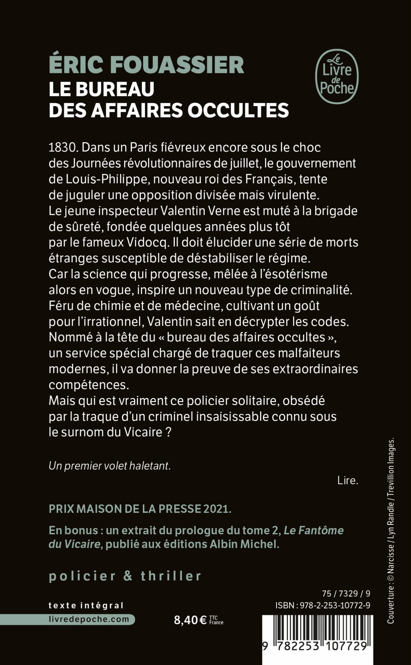 1830, dans un Paris fiévreux encore sous le choc des Journées révolutionnaires de juillet, le gouvernement de Louis-Philippe, nouveau roi des Français, tente de juguler une opposition divisée mais virulente. Le jeune inspecteur Valentin Verne est muté à la brigade de Sûreté, fondée quelques années plus tôt par le fameux Vidocq. Il doit élucider une série de morts étranges susceptible de déstabiliser le régime. Car la science qui progresse, mêlée à l’ésotérisme alors en vogue, inspire un nouveau type de criminalité. Féru de chimie et de médecine, cultivant un goût pour l’irrationnel, Valentin sait en décrypter les codes. Nommé à la tête du « bureau des affaires occultes », un service spécial chargé de traquer ces malfaiteurs modernes, il va donner la preuve de ses extraordinaires compétences.