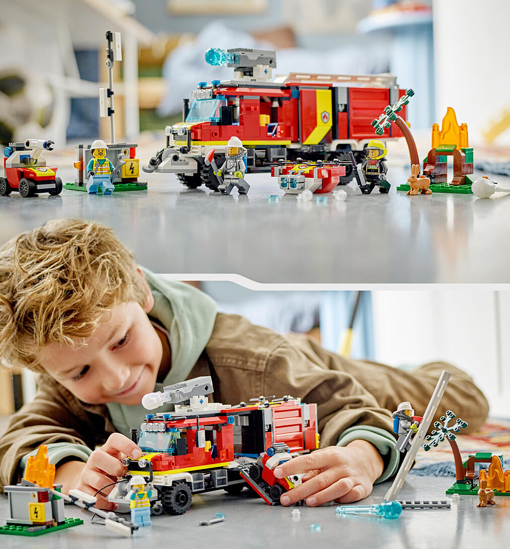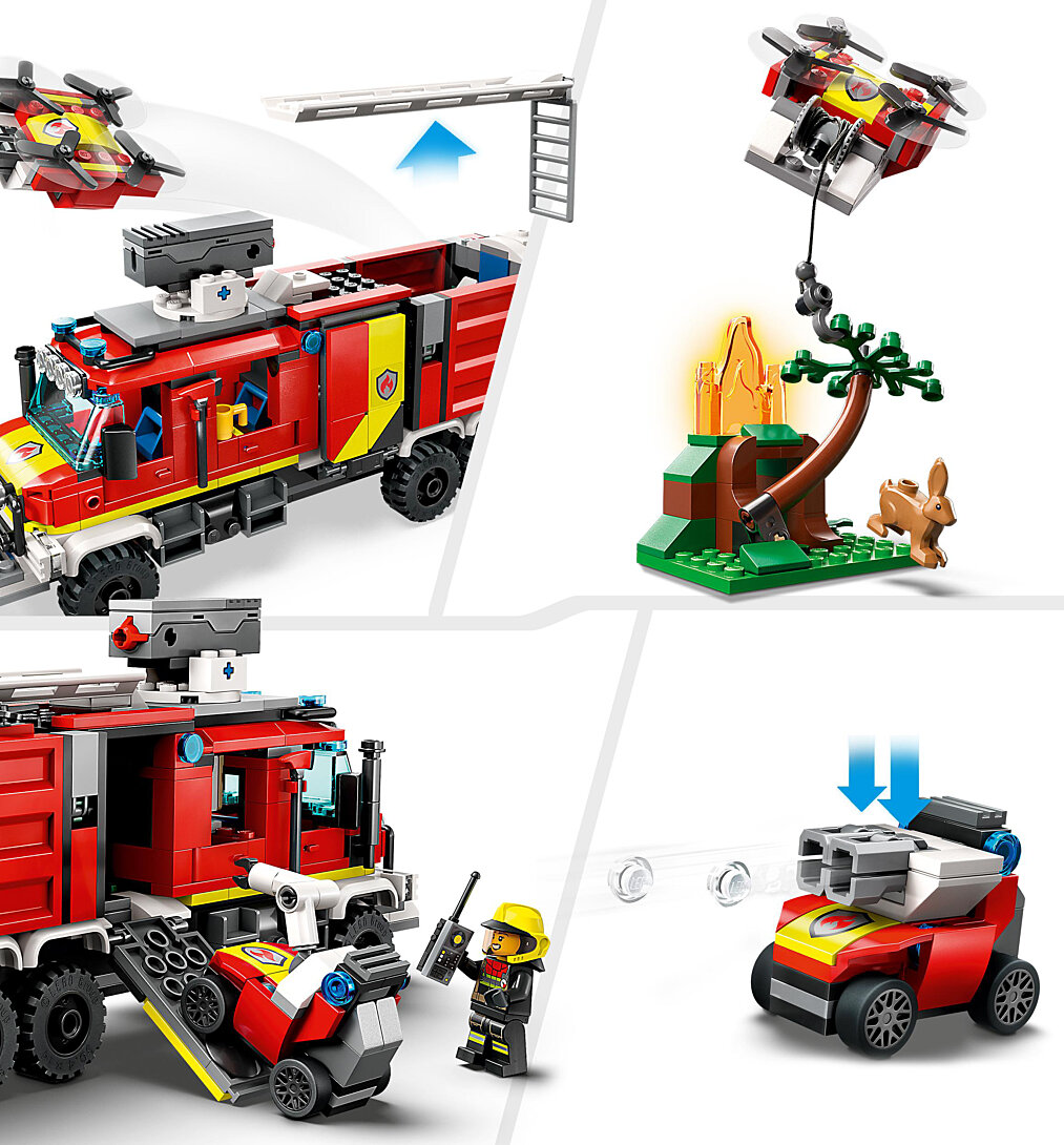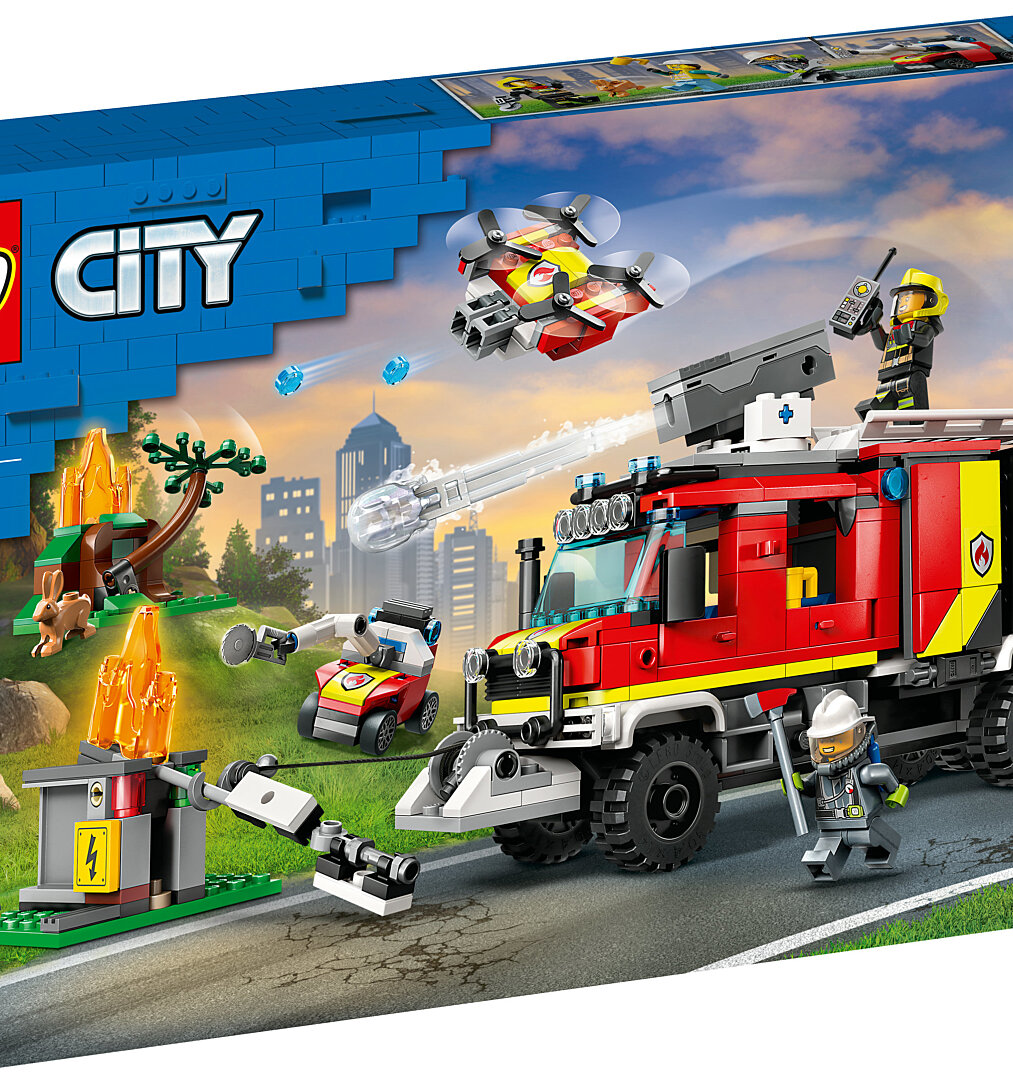 Les enfants rejoignent les pompiers de LEGO City à bord de l'unité de commandement des pompiers ultramoderne. Ce véhicule d'urgence jouet a tout ce dont vous avez besoin pour un sauvetage en bonne et due forme ! Utilisez l'extincteur de l'unité et le drone de feu pour lancer des éléments spéciaux de lutte contre l'incendie. Déployez le treuil de l'unité pour déplacer des objets lourds. Et s'il fait trop chaud, envoyez le drone terrestre avec son bras robotisé. Il y a aussi 3 minifigurines LEGO de pompier et des outils de lutte contre l'incendie à ajouter à l'action !