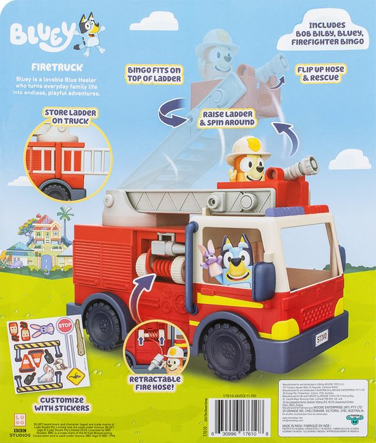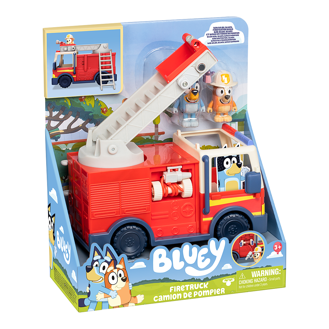 Découvre le camion de pompier de Bluey. Installe Bluey et Bingo à l’intérieur et amuse-toi à faire bouger la nacelle ou tirer la lance d’incendie !