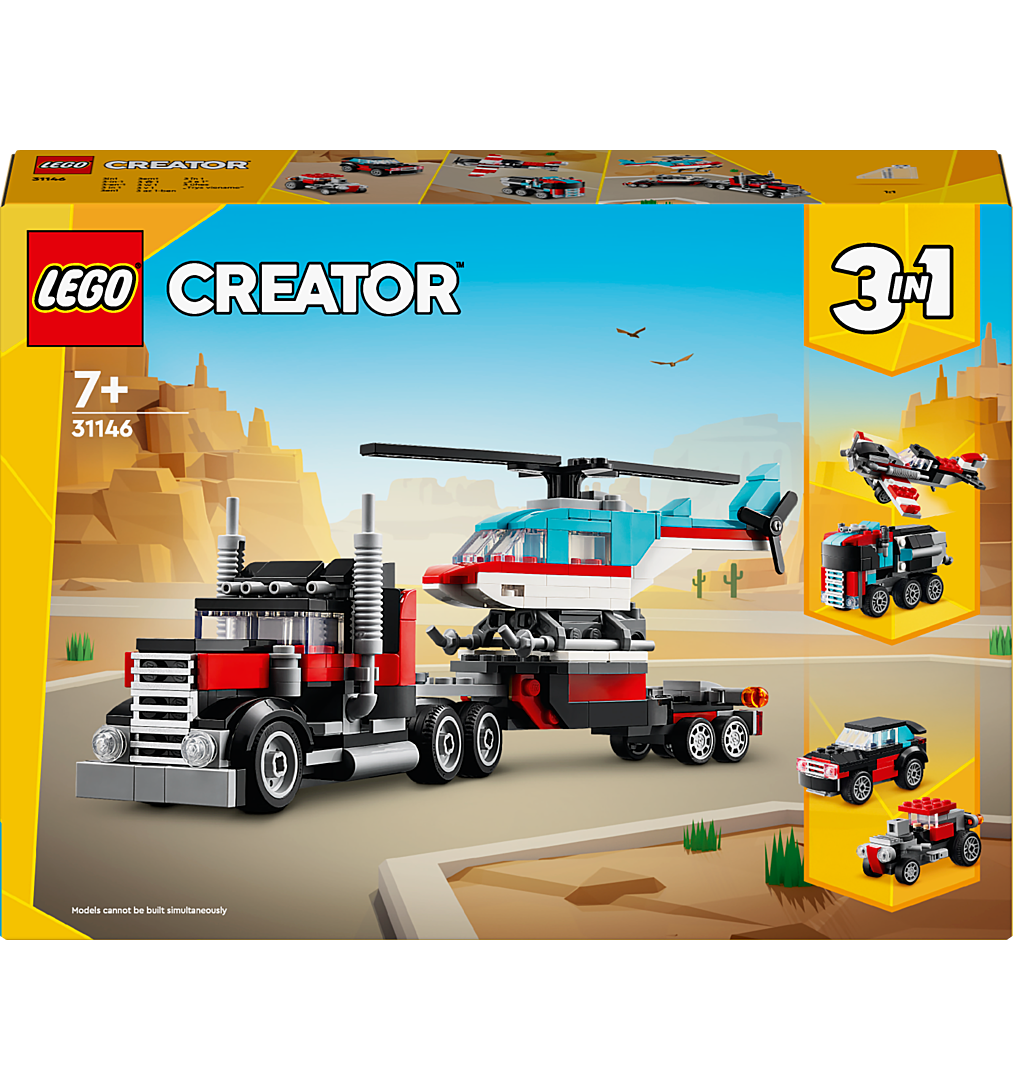 Le Camion Remorque avec Hélicoptère LEGO Creator (31146) permet aux garçons et aux filles de 7 ans et plus de vivre des aventures palpitantes. Les enfants peuvent assembler les 270 pièces de cet ensemble LEGO Creator 3-en-1 pour créer un camion jouet cool pour transporter le jouet d'hélicoptère sur sa remorque. Avec ce jouet LEGO Creator 3-en-1, votre enfant peut construire 3 x 2 véhicules différents. Votre enfant peut assembler le transporteur à plateau avec des roues pivotantes et l'hélicoptère LEGO avec des moteurs rotatifs, puis le transformer en un avion jouet LEGO avec une hélice et un camion-citerne, ou pour des courses passionnantes, en une voiture de course et un SUV. Bien sûr, les pièces de cet ensemble peuvent également être assemblées pour créer ses propres véhicules LEGO imaginaires. Les ensembles 3-en-1 offrent aux enfants aux intérêts variés des heures de plaisir de jeu avec un large choix de modèles. Cela inclut des voitures LEGO rapides, des animaux fascinants et des scènes de ville détaillées. Les jouets LEGO Creator 3-en-1 sont d'excellents cadeaux pour les amateurs de voitures de 7 ans qui aiment construire leurs propres machines impressionnantes.