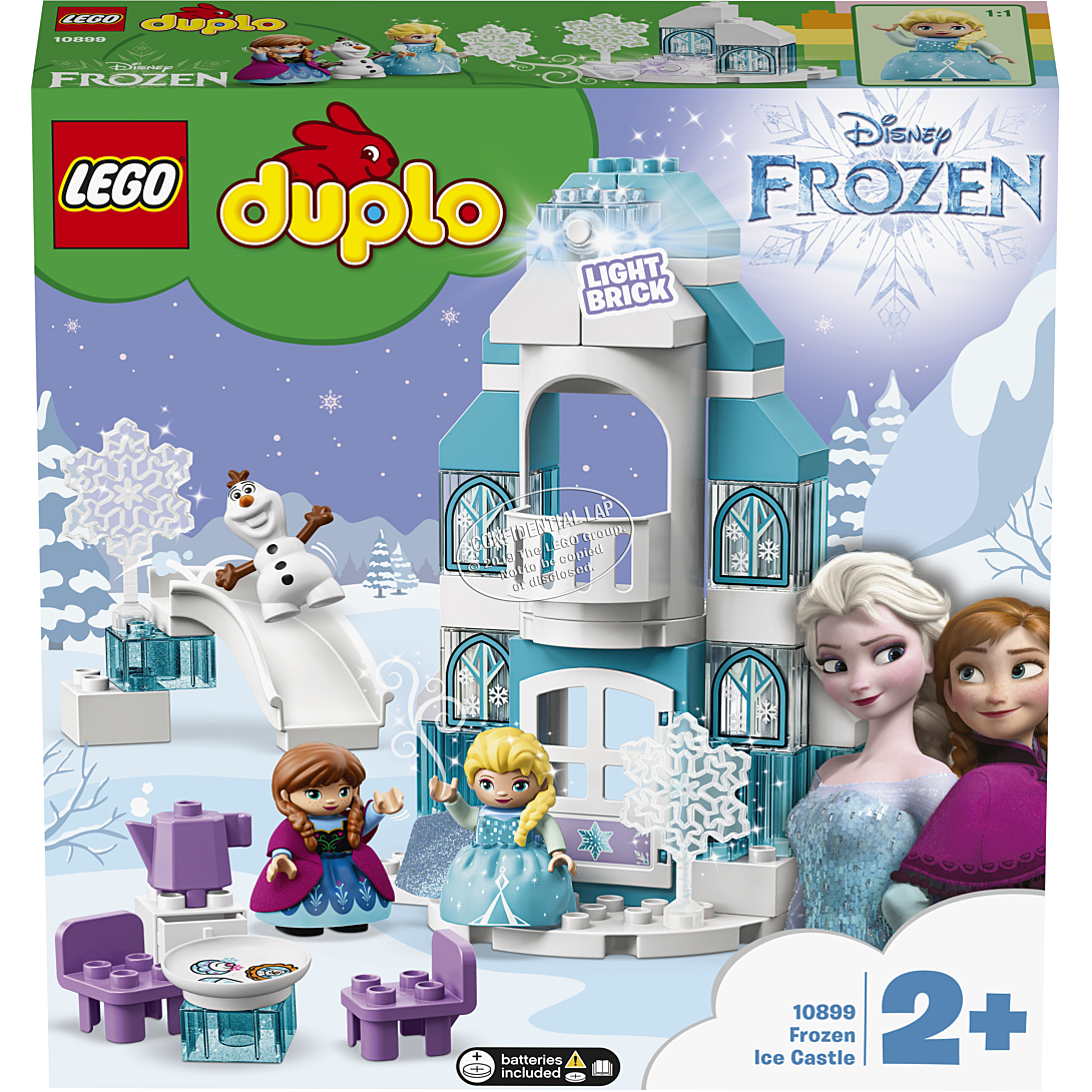 Rejoignez Anna, Elsa et Olaf de Disney au Château de la Reine des neiges LEGO DUPLO Disney 10899 pour partager un jeu imaginatif et de précieuses étapes de développement avec votre enfant d'âge préscolaire. En jouant un rôle avec leurs personnages préférés du Château de la Reine des neiges, les enfants de 2 ans et plus améliorent leurs compétences linguistiques et leur motricité fine, et développent leur conscience sociale et émotionnelle. Imaginez des discussions entre la mini-poupée reine de neiges Elsa et sa sœur, la princesse Anna et amusez-vous à créer Olaf le bonhomme de neige. Grâce à une brique lumineuse qui illumine le château par simple pression sur un bouton, votre enfant et vous aurez un plaisir infini à recréer des scènes du film La Reine des neiges et à imaginer vos propres histoires avec cet étincelant château fort jouet éducatif à construire pour les tout-petits. Le château de la Reine des neiges mesure plus de 28 cm de haut, 19 cm de large et 16 cm de profondeur. Ce château de Princesses Disney de la Reine des neiges contient un toboggan, des briques de ""glace"" transparentes, ainsi qu'une table, des chaises et des équipements de cuisine Ce jeu de la reine des neiges pour enfants de 2 ans et + comprend une brique lumineuse spéciale avec bouton qui fournit un éclairage multicolore au château Reine des neigesCe jeu de construction pour les enfants 2 ans et + est conçu pour encourager les jeux de rôle et aider à développer ses compétences linguistiques, sociales et émotionnellesNombre de pièces : 59 piècesÂge : 2+