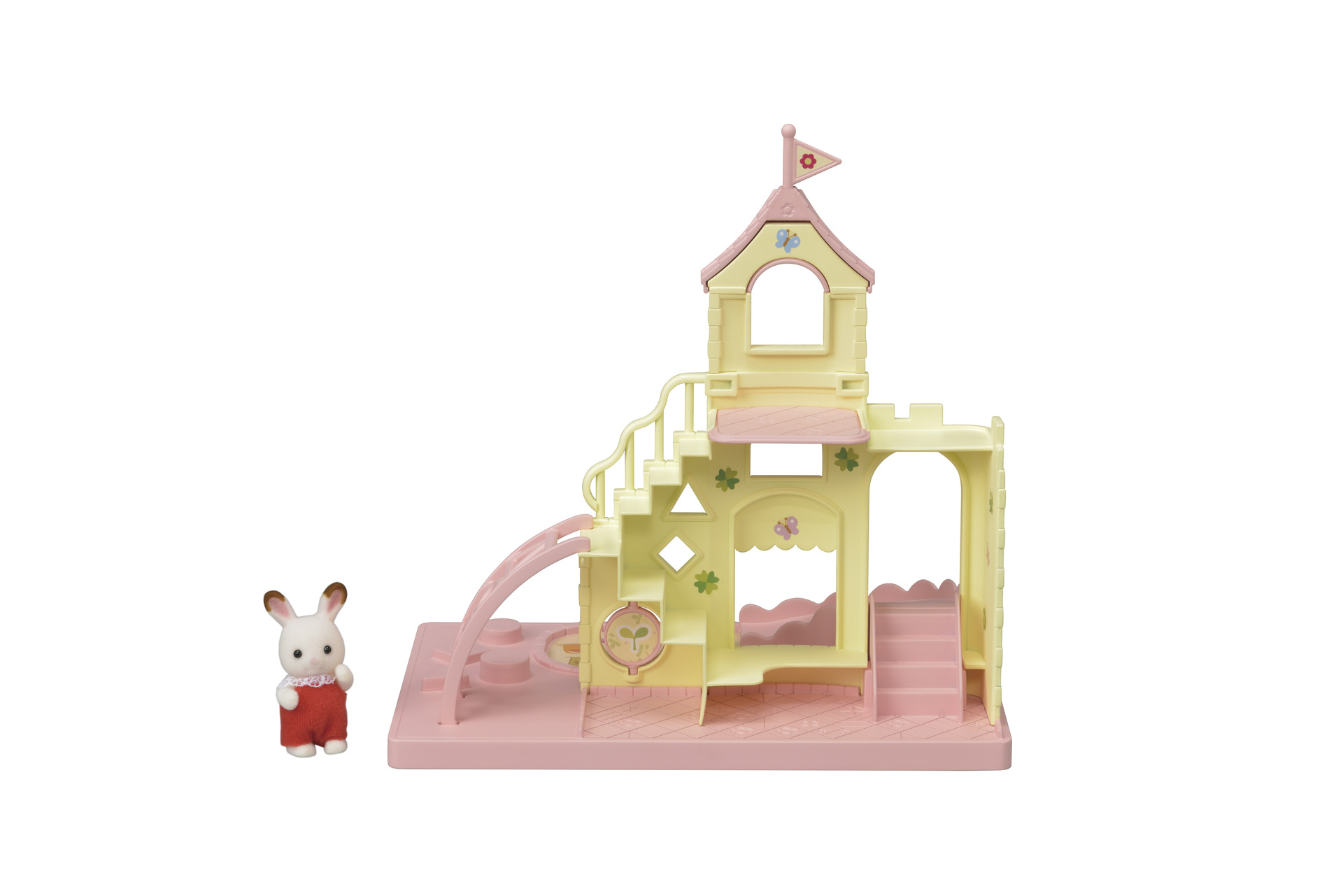 Ce prêt à jouer contient Crème, le bébé lapin chocolat. Quel endroit amusant pour les bébés ! Ils glissent sur le toboggan, grimpent à l'echelle, jouent dans le bac à sable et ont beaucoup d'autres activités !