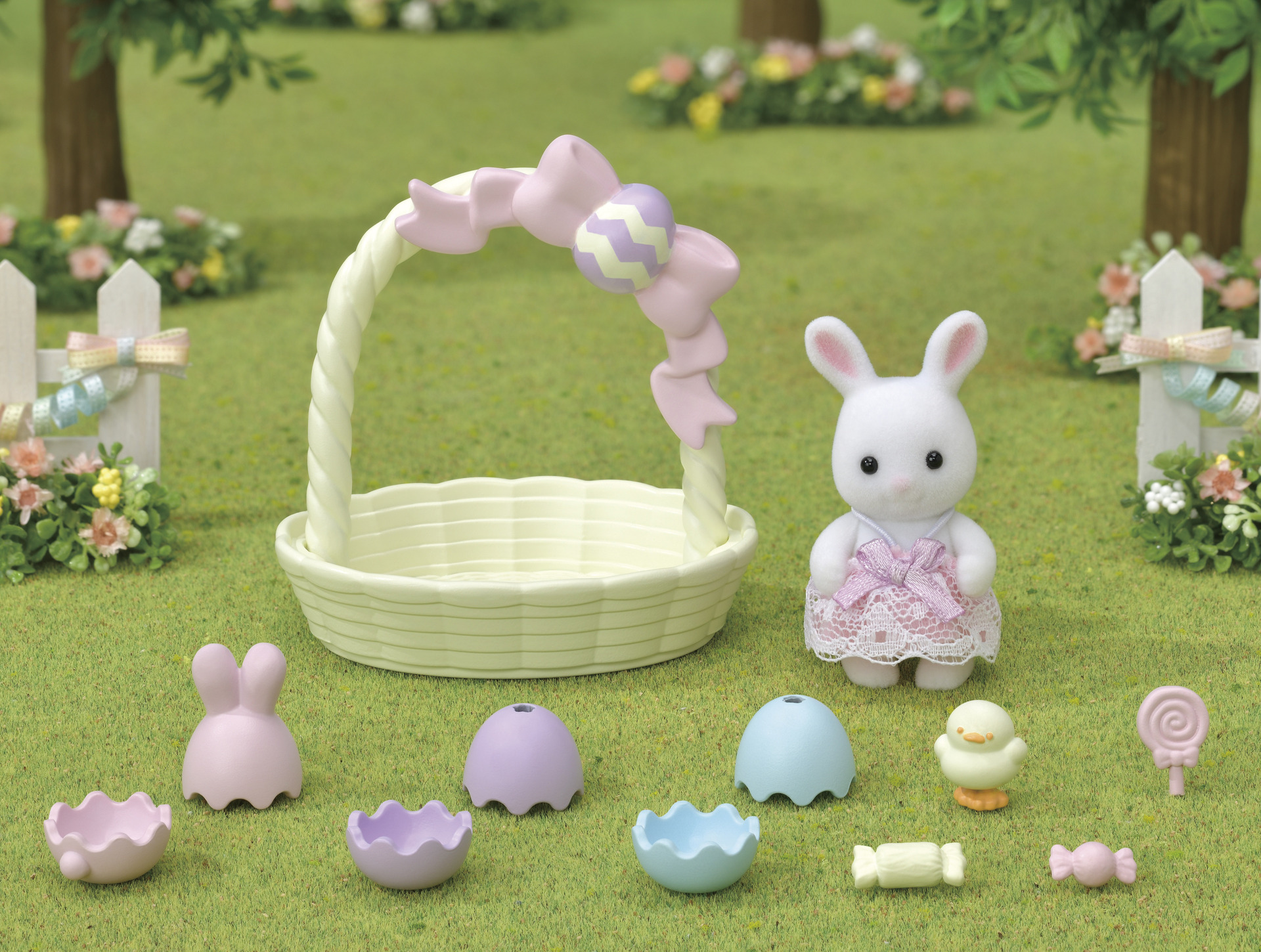 Les bébés Sylvanian sont tous réunis dans le jardin, à la recherche des chocolats de Pâques ! Le bébé lapin blanc a déjà déposé 3 œufs dans son panier.
