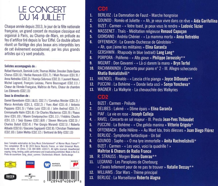 | Liste des pistes | 2.1 . carmen - overture - Multi-Artistes 2.2 . lakmé - act 1 - "dôme épais" - Netrebko, Anna,Garanca, Elina,Delibes, Léo,Armiliato, Marco,Multi-Artistes,Orchestre National De France,Ozawa, Seiji,Baden-Baden Und Freiburg, Swr Sinfonieorchester 2.3 . la vie en rose - Bbc Concert Orchestra,Calleja, Joseph,Sidorova, Ksenija,Louiguy,Multi-Artistes,Mercurio, Steven 2.4 . piano concerto in g - 3. presto - Dutoit, Charles,Thibaudet, Jean-Yves,Ravel, Maurice,Multi-Artistes,De Montréal, Orchestre Symphonique 2.5 . la bohème, act 1 - che gelida manina - Puccini, Giacomo,Multi-Artistes,Di Parma, Orchestra Del Teatro Regio,Morandi, Pier Giorgio,Grigolo, Vittorio 2.6 . la belle hélène, act 1 - "au mont ida, trois déesses" - Keck, Jean-Christophe,Florez, Juan Diego,Multi-Artistes,Comunale Di Bologna, Orchestra Del Teatro,Abbado, Roberto 2.7 . symphonie fantastique, op. 14, h 48 - 2. un bal (valse : allegro non troppo) - Barenboim, Daniel,Berlioz, Hector,Multi-Artistes,Orchestre De Paris 2.8 . sapho, cg 1, act 3 - o ma lyre éternelle - Rachvelishvili, Anita,Rachvelishvilli, Anita,Gounod, Charles,Sagripanti, Giacomo,Multi-Artistes,Nazionale Della Rai, Orchestra Sinfonica 2.9 . carmen, act 3 - "les voici! voici la quadrille!" - Choeurs De Radio France,Bizet, Georges,Multi-Artistes,Maitrise De Radio France, R.T.F. 2.10 . morgen - Thielemann, Christian,Multi-Artistes,Munchner Philharmoniker,Strauss, Richard 2.11 . les parapluies de cherboug : "j'avais tellement peur de ne pas te trouver" - Naouri, Laurent,Legrand, Michel,Multi-Artistes,Dessay, Natalie 2.12 . star wars - main title - Williams, John,Los Angeles Philharmonic,Multi-Artistes,Mehta, Zubin 2.13 . la marseillaise - De Billy, Bertrand,Choeur De Chambre Les Eléments,Choeur De L'Armée Française,Rouget De Lisle, Claude Joseph,Covent Garden,Suhubiette, Joël,Maitrise De Paris,Multi-Artistes,The Royal Opera House, Orchestra Of,Marco, Patrick,De Plinval, Paul,Alagna, Roberto 1.1 . la damnation de faust, op.24 - marche hongroise - Barenboim, Daniel,Berlioz, Hector,Multi-Artistes,Orchestre De Paris 1.2 . roméo et juliette, cg9, act 1 "ah, je veux vivre dans ce rêve" - Garifullina, Aida,Meister, Cornelius,Multi-Artistes,Rso-Wien 1.3 . carmen, wd 31, act 2 - couplets : "votre toast, je peux vous le rendre" - Bizet, Georges,Tézier, Ludovic,Armiliato, Marco,Multi-Artistes,Baden-Baden Und Freiburg, Swr Sinfonieorchester 1.4 . thaïs, act 2 : méditation religieuse - symphonie - Massenet, Jules,Multi-Artistes,De Bordeaux-Aquitaine, Orchestre National,Capuçon, Renaud,Abel, Yves 1.5 . andrea chénier, act 3 : "la mamma morta" - Netrebko, Anna,Pappano, Antonio,Multi-Artistes,Nazionale Di Santa Cecili, Orchestra Dell'Accademia,Giordano, Umberto 1.6 . la grande-duchesse de gérolstein, act1 - rondeau "ah, que j'aime les militaires" - Licht, Dominik,Garanca, Elina,Luisi, Fabio,Offenbach, Jacques,Multi-Artistes,Harnisch, Rafael,State Opera Chorus, See: Dresden,Staatskapelle Dresden,Staatsopernchor Dresden,Müller, Thomas 1.7 . rhapsody in blue - Gershwin, George,Hancock, Herbie,Lang, Lang,London Symphony Orchestra,Multi-Artistes 1.8 . polifemo: alto giove - Concerto Koln,Axelrod, John,Multi-Artistes,Porpora, Nicola,Jaroussky, Philippe 1.9 . don giovanni, ossia il dissoluto punito, k.527, act 1 - Terfel, Bryn,Mackerras, Charles,Persson, Miah,Multi-Artistes,Scottish Chamber Orchestra,Mozart, Wolfgang Amadeus 1.10 . piano concerto no. 2 in c minor, op. 18 - allegro scherzando - Czech Philharmonic Orchestra,Buniatishvili, Khatia,Multi-Artistes,Järvi, Paavo,Rachmaninov, Sergey Vasil'Yevich 1.11 . rinaldo, hwv 7a / act 2 - lascia ch'io pianga - George Frideric Handel,Il Pomo D'Oro,Di Donato, Joyce,Emelyanychev, Maxim,Multi-Artistes 1.12 . la bohème, act 3 - donde lieta usci - Chaslin, Frederic,Multi-Artistes,La Comunitat Valenciana, Orquestra De,Yoncheva, Sonya 1.13 . dis walküre, www 86b - concert version - the ride of the walkyres - Barenboim, Daniel,Multi-Artistes,Orchestre De Paris,Wagner, Richard |