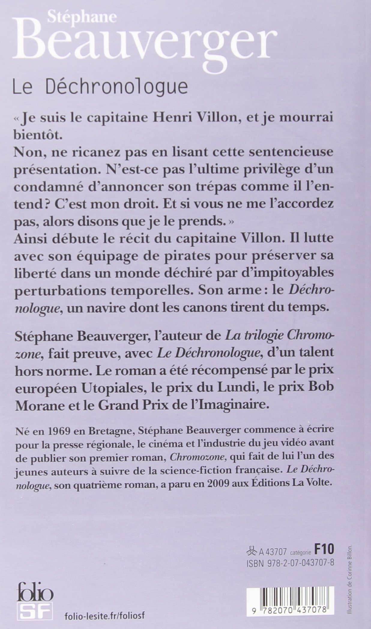Stéphane Beauverger, l'auteur de La trilogie Chromozone, fait preuve, avec Le Déchronologue, d'un talent hors norme. Le roman a été récompensé par le prix européen Utopiales, le prix du Lundi, le prix Bob Morane et le Grand Prix de l'Imaginaire.