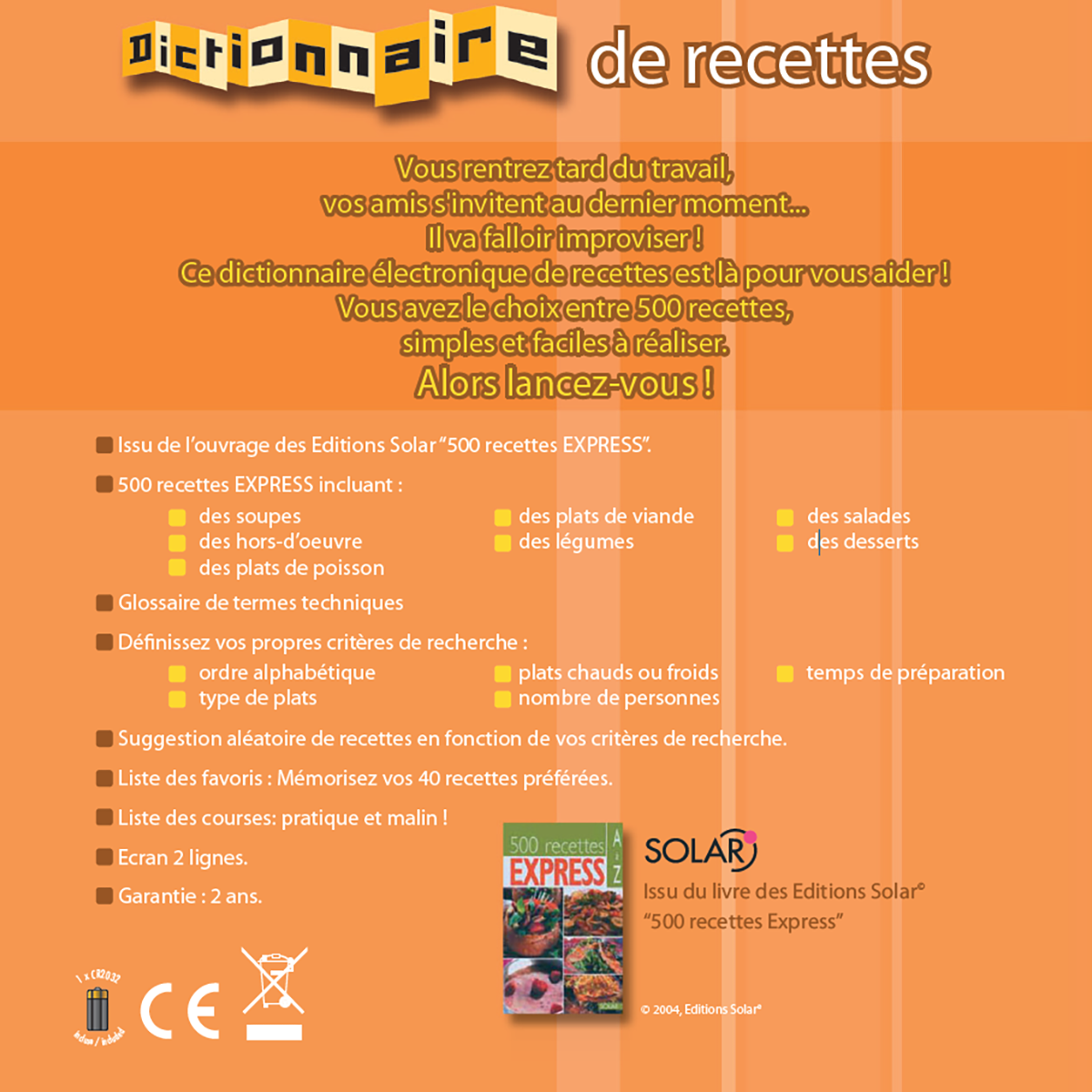 "Pour 60% des Francais, le temps est le premier critere pour se mettre en cuisine Faire la cuisine est synonyme : de ""convivialite"" a 61%, de ""plaisir"" a 59% et de ""partage"" a 51% -Ecran 2 lignes. -Base de donnees de 500 a 1000 recettes express. -Fonctio"