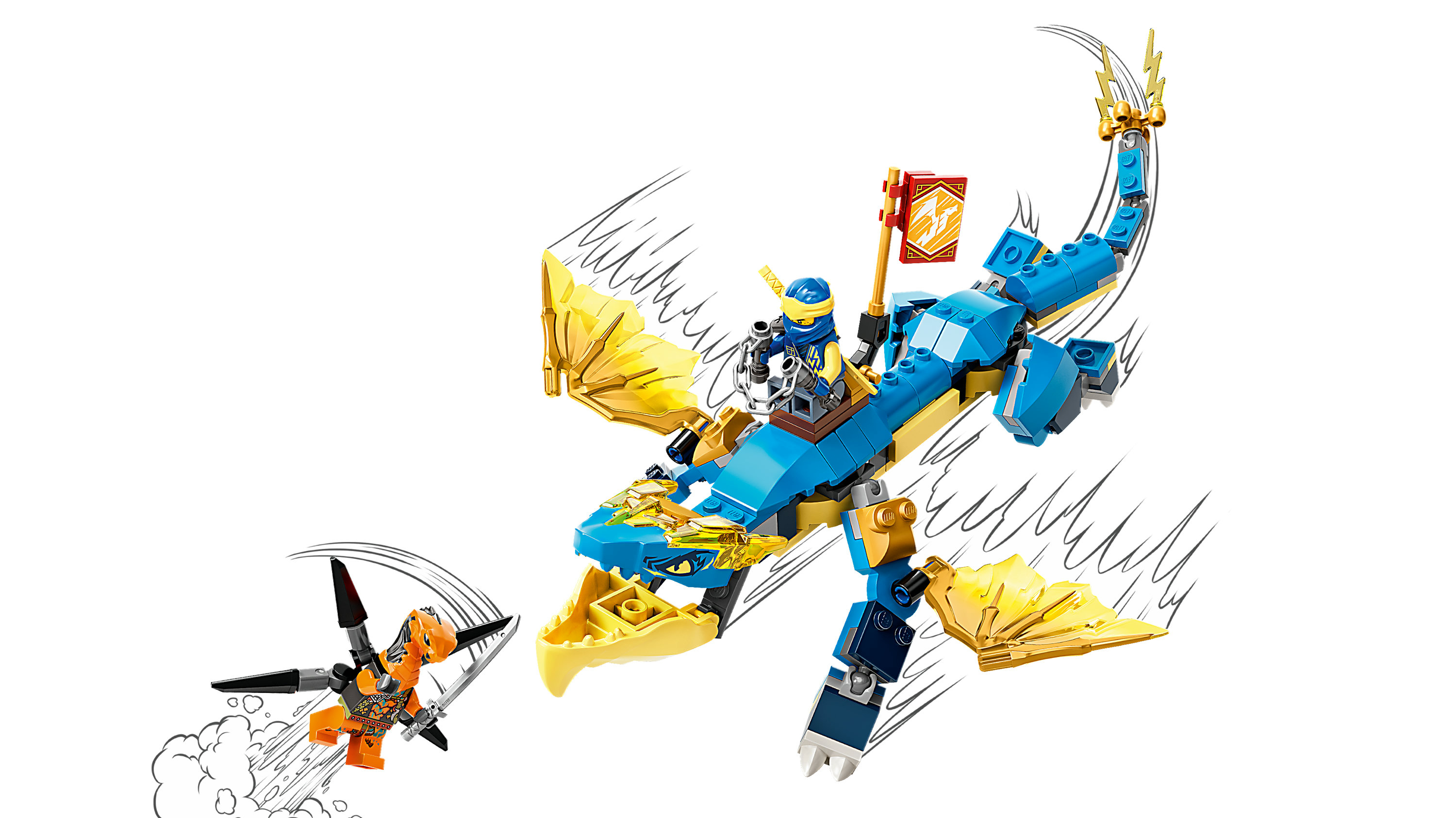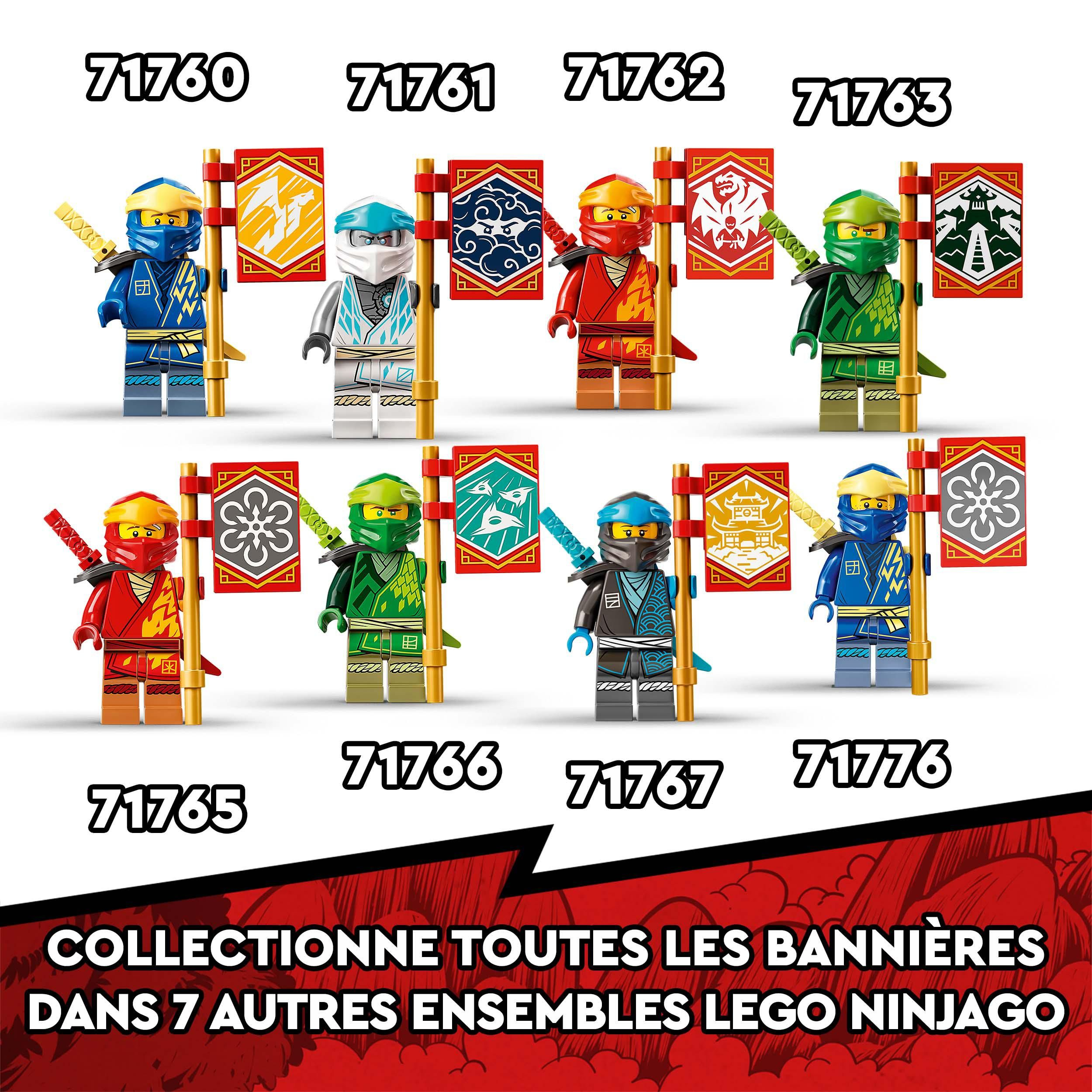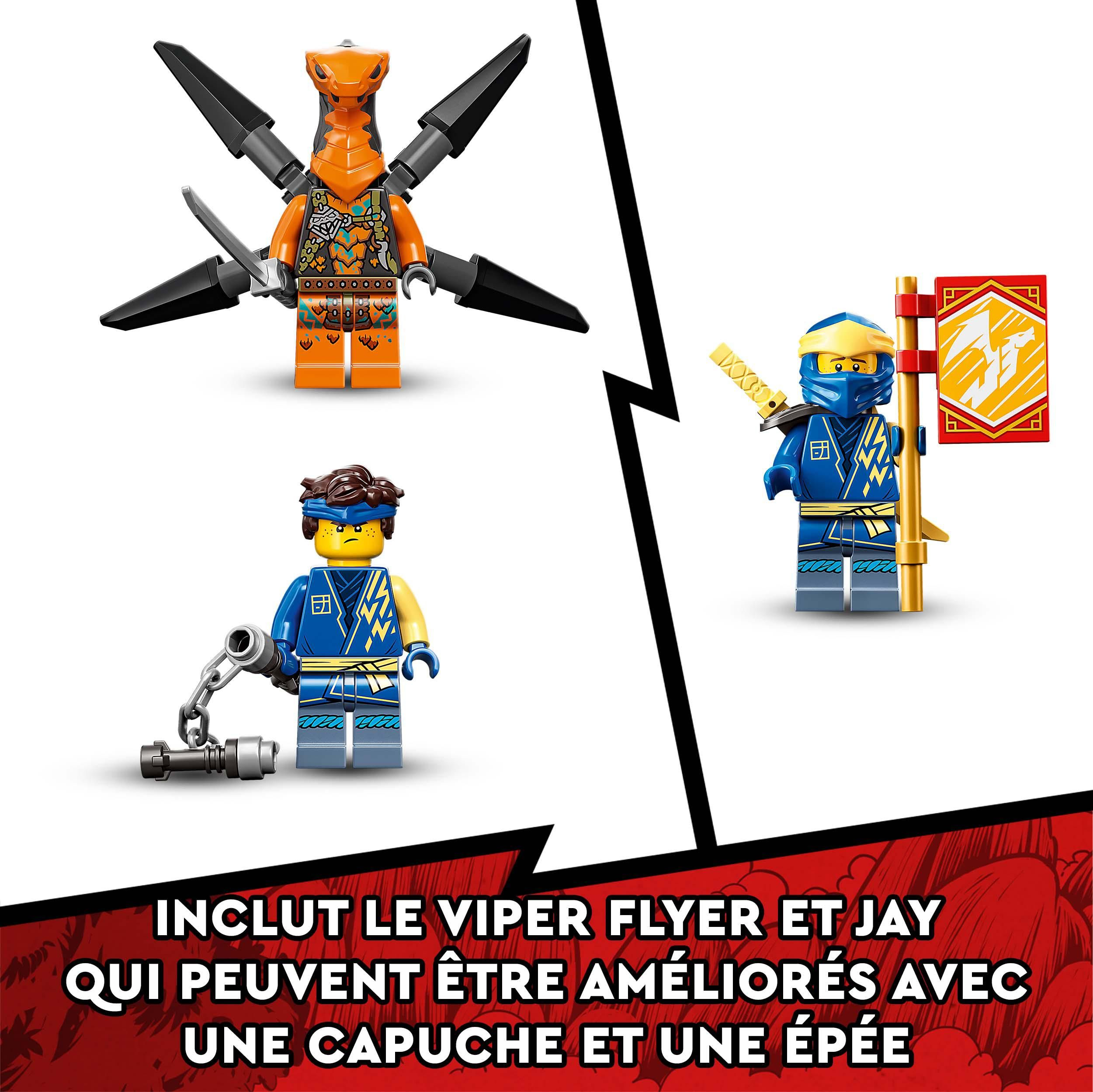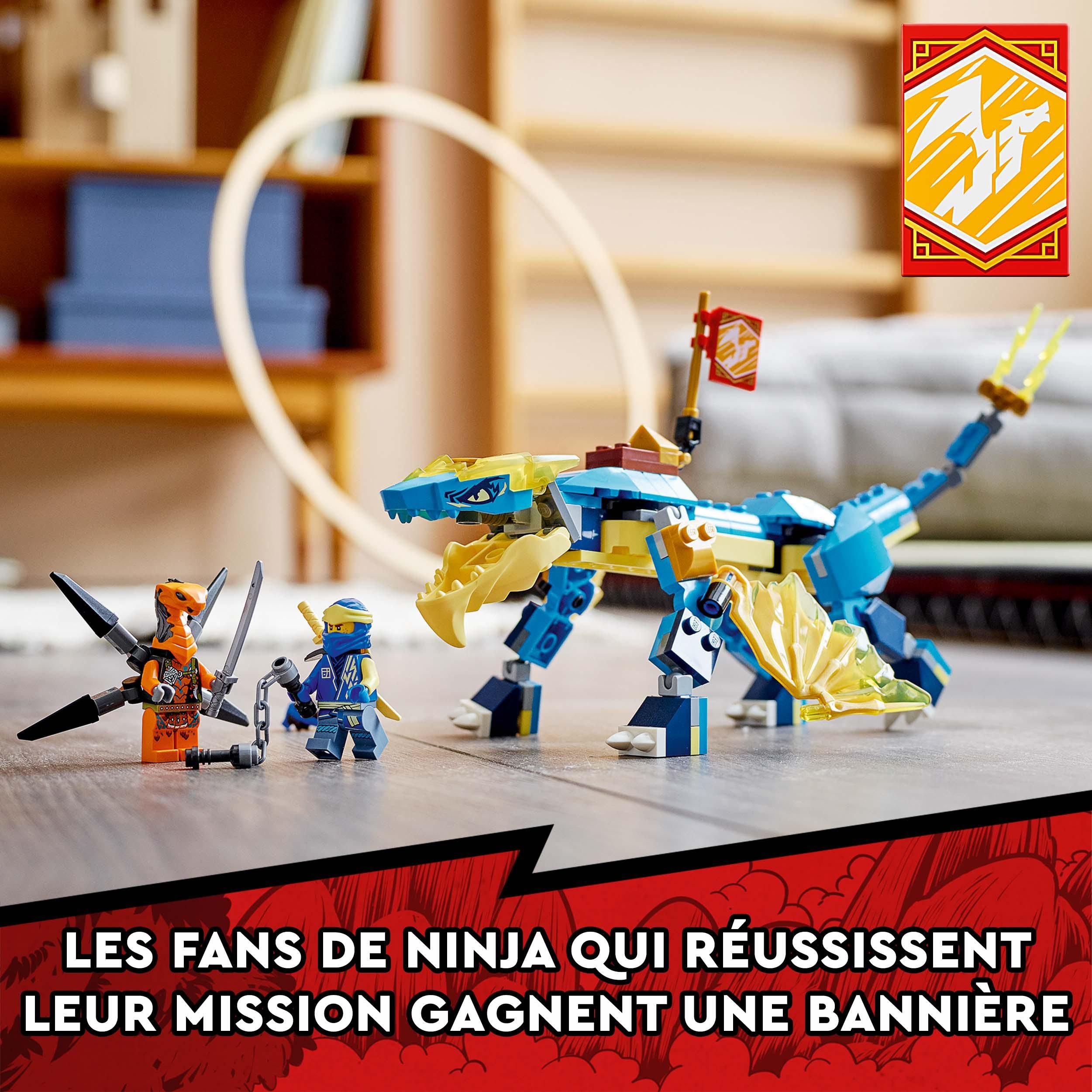 Les fans de ninjas vont pouvoir jouer pendant des heures avec ce dragon détaillé, doté d’une tête, de mâchoires et d’ailes mobiles, ainsi que d’une queue semblable à une arme.Les jeunes ninjas vont adorer inventer leurs propres histoires captivantes grâce au set LEGO NINJAGO L’évolution Dragon du tonnerre de Jay (71760). La figurine de dragon possède des jambes, des bras, une mâchoire et une tête articulés ainsi qu’une queue qui peut être utilisée comme une arme et améliorée avec des ailes plus grandes et puissantes.Ce jouet de construction de dragon LEGO NINJAGO (nouveauté janvier 2022), inclut 2 personnages : Jay de NINJAGO, muni de nunchakus et d’une épée, et le serpent LEGO NINJAGO Viper Flyer, muni d’un jetpack et d’une épée. Lorsque les enfants terrassent leurs ennemis ninjas et terminent leur mission, ils reçoivent une bannière à collectionner en récompense.Les jouets NINJAGO ont le pouvoir d’éloigner les enfants de leurs écrans pour les amener dans un monde palpitant, fantastique et captivant. Dans cet univers, ils peuvent faire équipe avec les courageux héros ninja et battre les méchants avec un ensemble de sets de construction LEGO qui comprennent des motos, des robots d’action et des temples ninja. Les jouets de construction NINJAGO constituent également un incroyable cadeau d’anniversaire pour les enfants dès 6 ans fans de ninjas et de batailles.Nombre de pièces : 140 piècesÂge : 6+