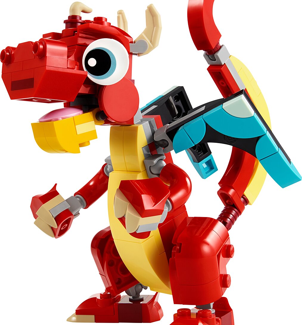 Le Dragon Rouge LEGO Creator (31145) est un jouet 3-en-1 qui permet aux enfants créatifs de 6 ans et plus de voyager dans un monde magique et de raconter des histoires passionnantes. Avec ce jouet animal, vous pouvez construire un dragon LEGO, un phénix LEGO et un poisson LEGO. Ce set LEGO Creator offre à votre enfant d'innombrables possibilités de jeu avec 3 figurines animales différentes qu'il peut construire avec les briques de la même boîte. Votre enfant peut construire une figurine de dragon mobile, puis la transformer en un jouet d'oiseau LEGO aux plumes colorées, en un poisson aux nageoires mobiles ou en sa propre créature LEGO. Le jouet de dragon amical a de grands yeux et peut déplacer ses bras, mains, ailes, jambes, tête et mâchoire, afin de pouvoir être posé dans la bonne pose après chaque aventure et impressionner ensuite lorsqu'il est exposé. Les ensembles LEGO Creator 3-en-1 offrent aux enfants aux intérêts variés des heures de plaisir de jeu avec un large choix de modèles. Cela inclut des véhicules rapides, des animaux fascinants et des scènes de ville détaillées. Ces jouets LEGO Creator 3-en-1 sont d'excellents cadeaux pour les enfants, garçons et filles, qui aiment construire de manière créative et adorent les jouets animaux fantastiques.