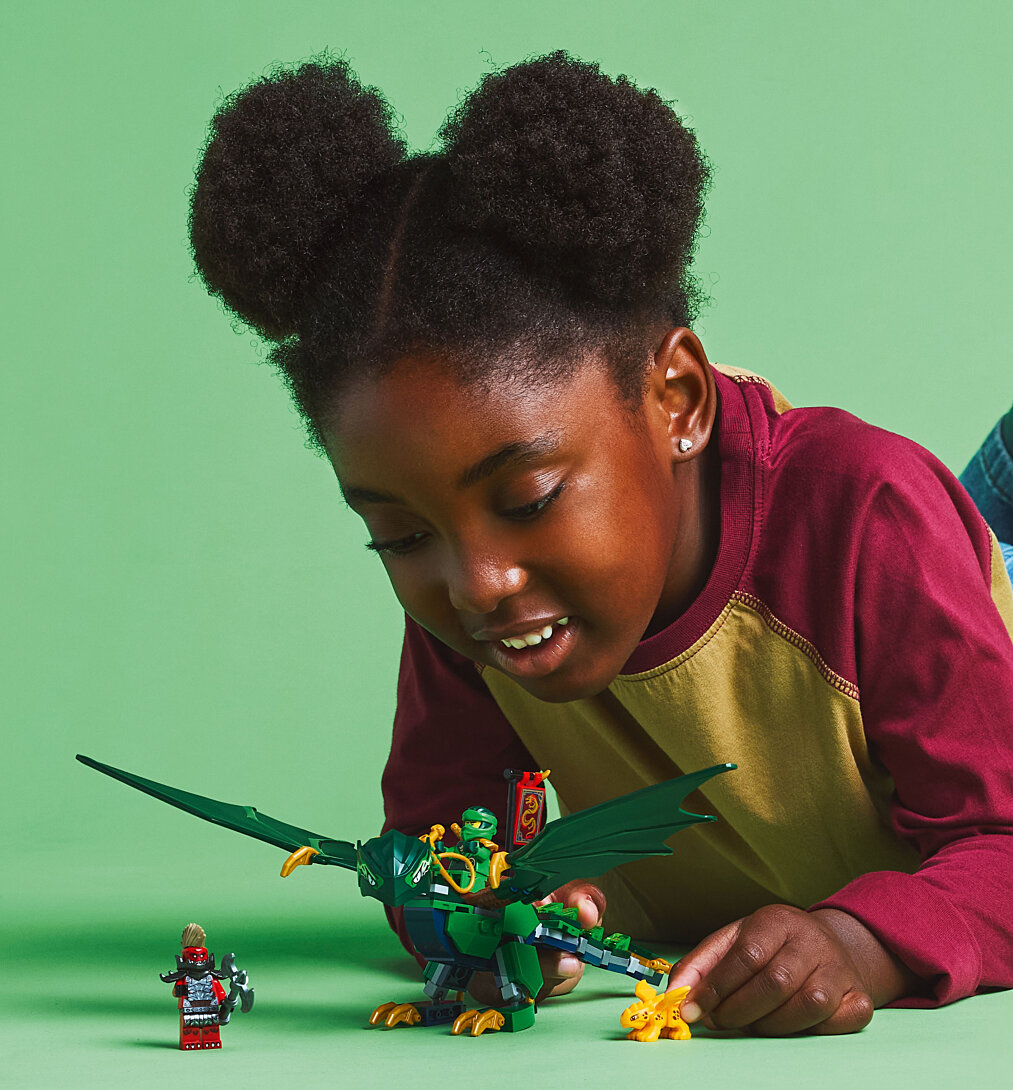 Les garçons et les filles dès 6 ans peuvent s’envoler dans le ciel pour recréer les scènes aériennes de la saison 3 de la série TV NINJAGO® Le soulèvement des dragons avec Le dragon vert de la forêt de Lloyd (71829). Ce set inclut un dragon doté d’une queue, d’un cou, de pattes, de grandes ailes et de mains mobiles, ainsi que d’une selle pour une minifigurine. Ce jouet LEGO® NINJAGO inclut également 2 minifigurines : Lloyd équipé d’un katana d’or et un méchant Éclaireur draconique avec une hache. Les enfants peuvent aussi jouer à s’occuper du bébé dragon doré. La gamme de sets de construction LEGO NINJAGO inclut des robots, des véhicules et des temples qui encouragent les fans à s’évader dans un univers fantastique aux côtés de leurs héros (sets vendus séparément). L’appli LEGO Builder vous permet de vivre une aventure de construction simple et intuitive avec votre enfant. Ce set de construction LEGO® de 128 pièces contient un dragon articulé qui mesure plus de 10 cm de haut, 24 cm de long et 33 cm de large