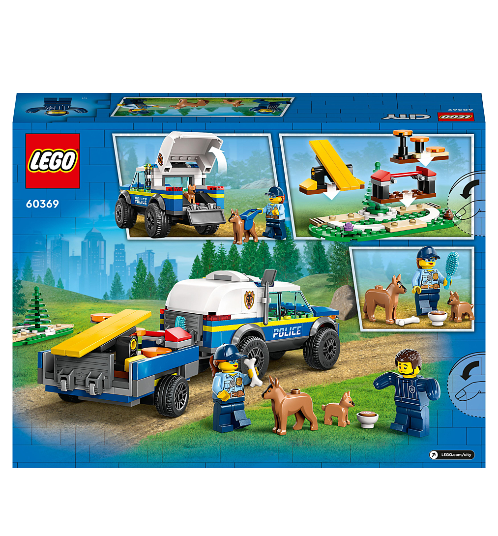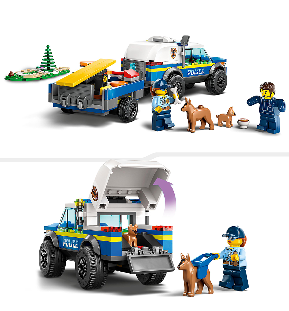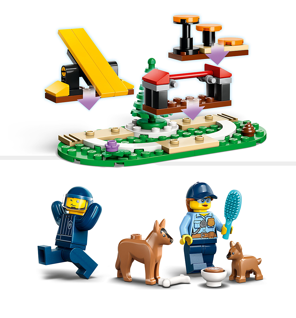 Plus produit Le set LEGO® City Le dressage des chiens policiers inclut un SUV, une remorque, 3 activités de dressage, 2 minifigurines et 2 chiens, dont un chiot.
