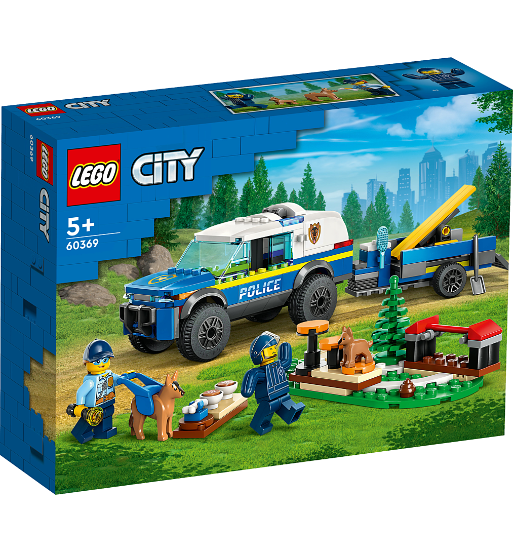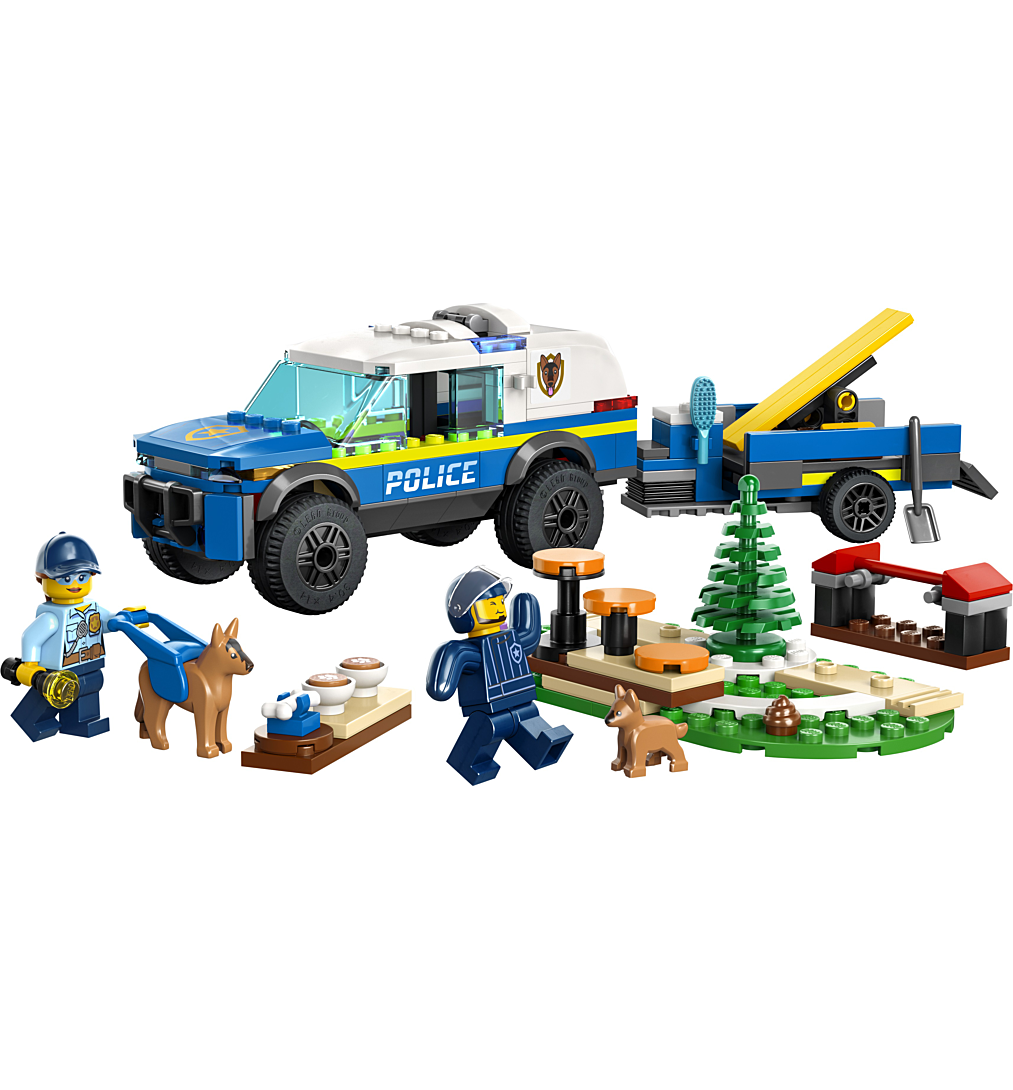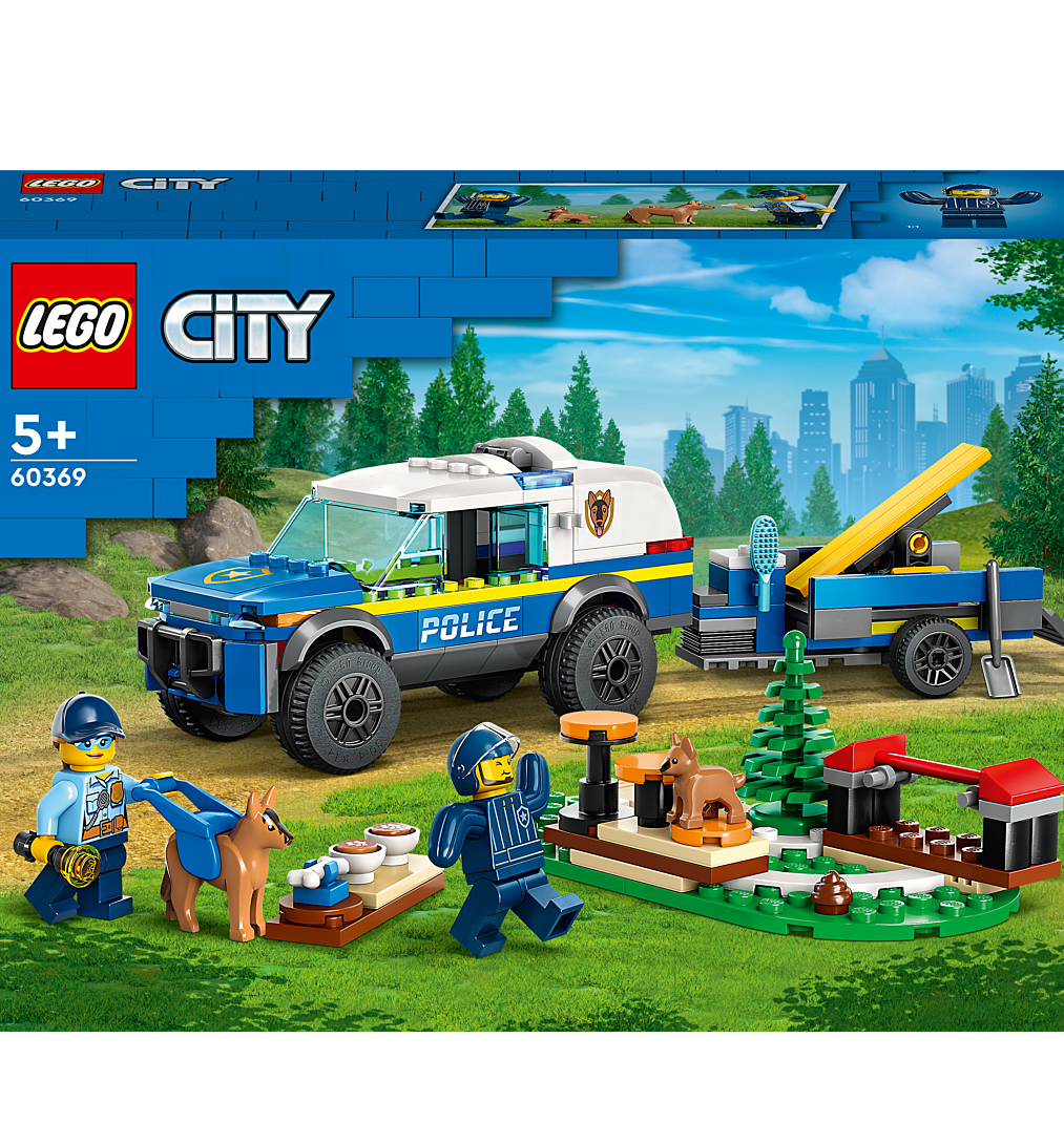 Plus produit Le set LEGO® City Le dressage des chiens policiers inclut un SUV, une remorque, 3 activités de dressage, 2 minifigurines et 2 chiens, dont un chiot.