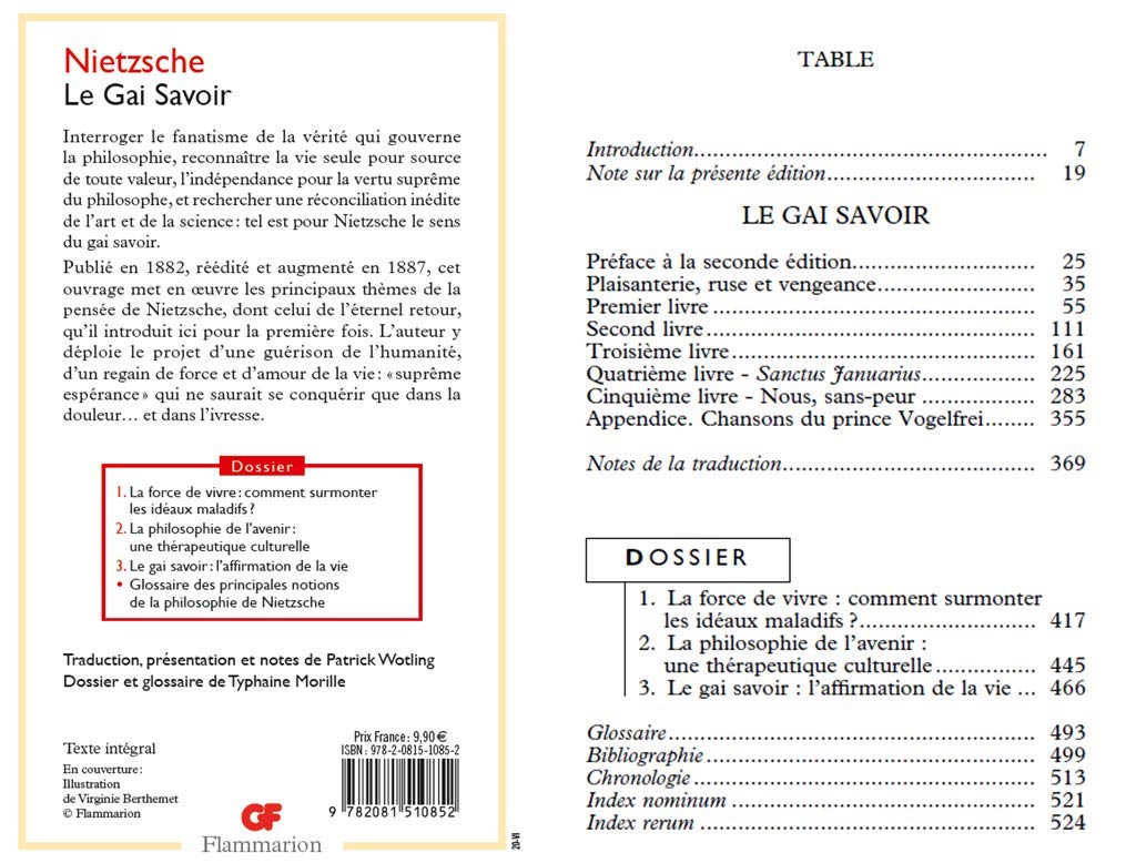 Interroger le fanatisme de la vérité qui gouverne la philosophie, reconnaître la vie seule pour source de toute valeur, l'indépendance pour la vertu suprême du philosophe, et rechercher une réconciliation inédite de l'art et de la science : tel est pour Nietzsche le sens du gai savoir. Publié en 1882, réédité et augmenté en 1887, cet ouvrage met en oeuvre les principaux thèmes de la pensée de Nietzsche, dont celui de l'éternel retour, qu'il introduit ici pour la première fois. L'auteur y déploie le projet d'une guérison de l'humanité, d'un regain de force et d'amour de la vie : "suprême espérance" qui ne saurait se conquérir que dans la douleur... et dans l'ivresse. Dossier - La force de vivre : comment surmonter les idéaux maladifs ? - La philosophie de l'avenir : une thérapeutique culturelle - Le gai savoir : l'affirmation de la vie - Glossaire des principales notions de la philosophie de Nietzsche.