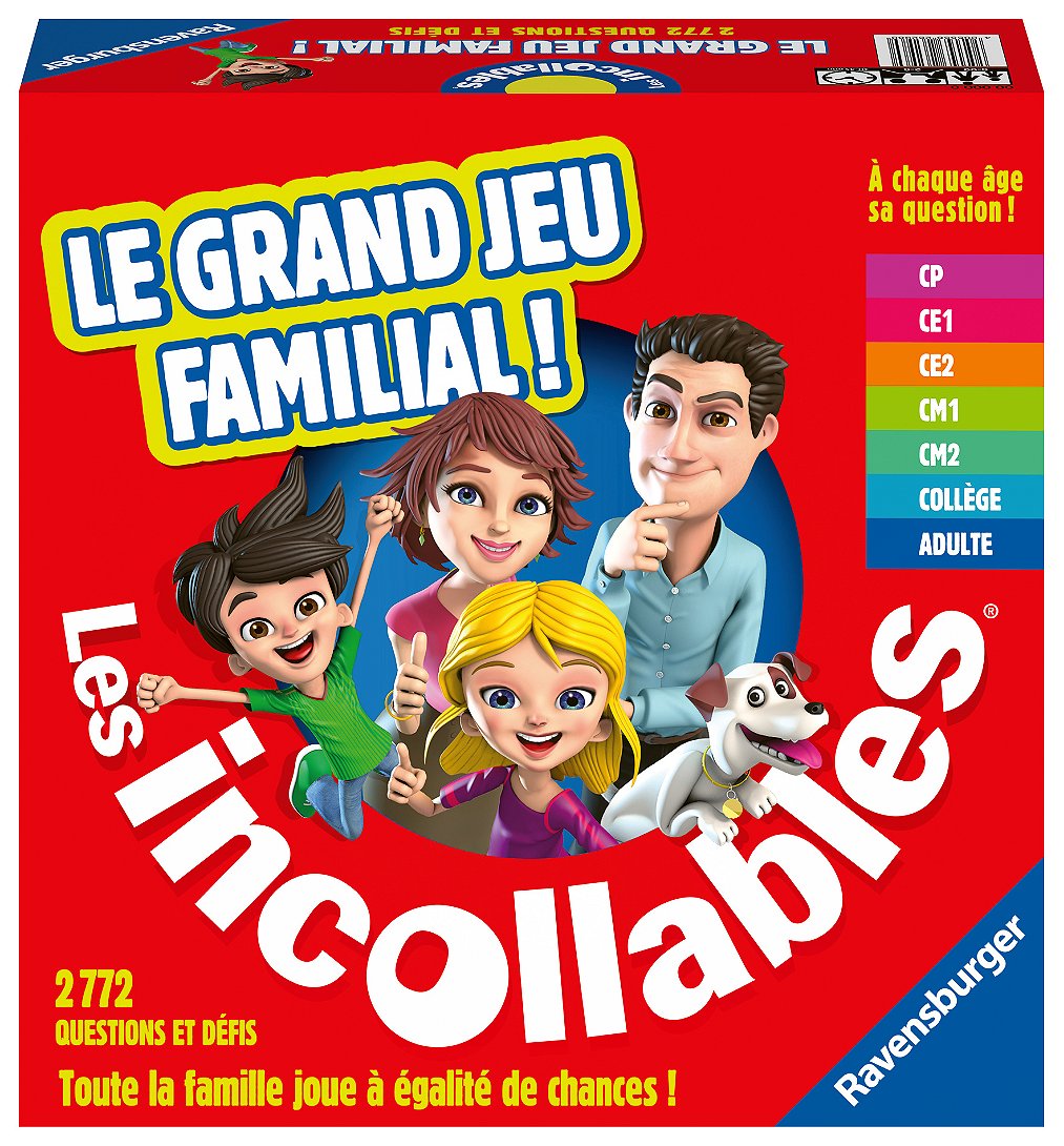 Le seul jeu de quiz vraiment adapté à toute la famille ! Grâce aux 7 niveaux de difficulté (CP-CE1-CE2-CM1-CM2-Collège-Adulte), toute la famille joue à égalité de chance. Enfin un jeu de quiz où les enfants peuvent gagner contre leurs parents ! 2772 questions autour de 6 thèmes incontournables : Maths-Français / Animaux / Citoyenneté / Histoire / Découverte du monde / Loisirs. Mais aussi beaucoup d'interactions entre les joueurs avec des défis, des duels, des énigmes et de la rapidité ! Action, réflexion et fous rires garantis avec les Incollables ! Dès 6 ans. De 2 à 6 joueurs.