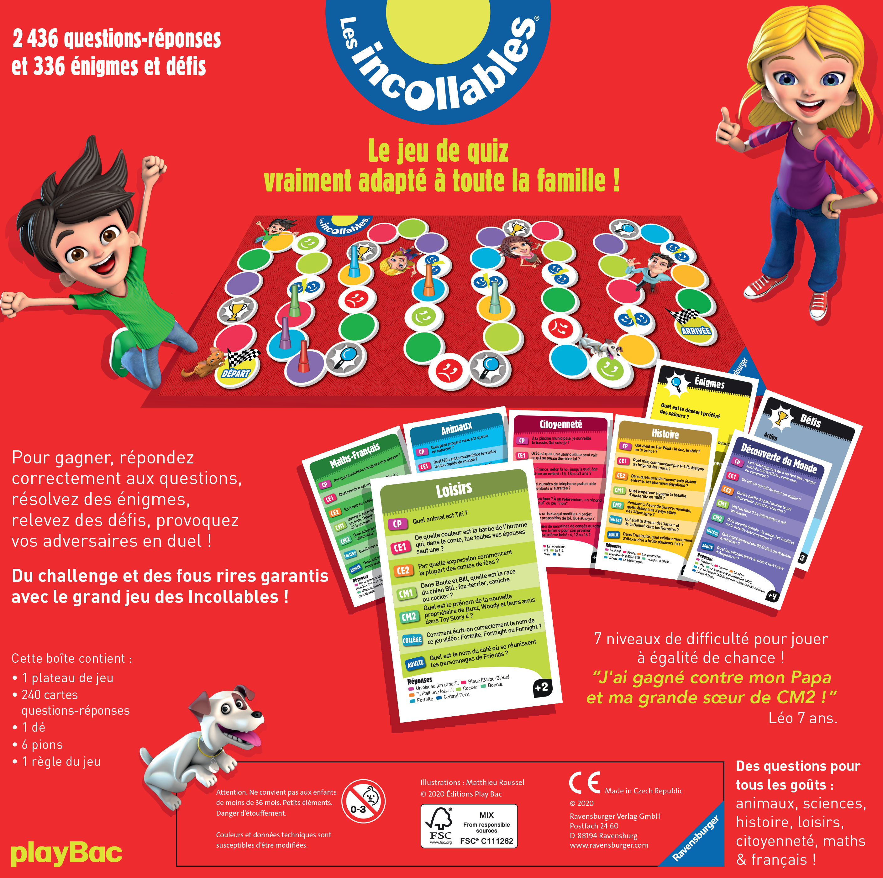 | Plus produit | JEU DE QUIZ FAMILIAL : Le seul jeu de questions-réponses vraiment adapté à toute la famille ! Enfin un jeu de quiz où les enfants peuvent gagner contre leurs parents ! A vous d\'avancer sur le plateau en répondant correctement aux questions et aux défis posés ! 6 THÉMATIQUES INCONTOURNABLES : Maths-Français / Animaux / Citoyenneté / Histoire / Découverte du monde / Loisirs. Cette diversité dans les thématiques permet à chacun d\'exceller dans son domaine de prédilection ! 2 772 questions, défis et énigmes pour s\'amuser et apprendre en famille! CHACUN JOUE A SON NIVEAU : 7 niveaux de difficulté (CP, CE1, CE2, CM1, CM2, Collège et Adulte) pour jouer en famille à égalité de chance ! Grâce à ce système, le jeu évolue avec vos enfants tout au long de leur apprentissage. Enfin un jeu de quiz où les enfants peuvent battre les parents ! DES RÈGLES SIMPLES : Le joueur lance le dé et avance son pion. Selon la case sur laquelle il s\'arrête, il répond à une question, une énigme ou à un défi. Lorsque le joueur répond correctement, il avance son pion. Le joueur qui atteint en premier la case ARRIVÉE et répond correctement à une question posée gagne la partie. CONTENU : 1 plateau de jeu, 174 cartes questions-réponses, 36 cartes défis, 30 cartes énigmes, 1 dé, 6 pions, 1 règle du jeu. De 2 à 6 joueurs et à partir de 6 ans. Une partie dure entre 30 à 45 minutes. Découvrez aussi la collection des jeux Incollables : le jeu des 7 familles, le jeu des énigmes et le p\'tit bac. |