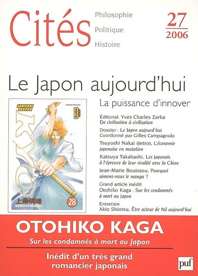 Un dossier sur le Japon et son paysage social et économique avec au sommaire notamment : Le jeu dangereux du nationalisme : les Japonais à l'épreuve de leur rivalité avec la Chine (K. Takahashi) ; Le pacifisme de la Constitution japonaise est-il un simple optimisme ou une lumière au XXIe siècle ? (H. Nakamura) ; Comment la société japonaise se relève après la crise (G. Campagnolo).