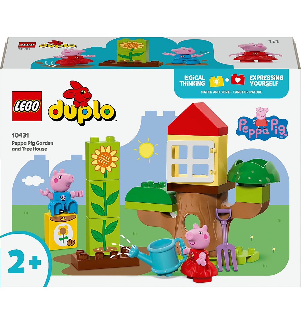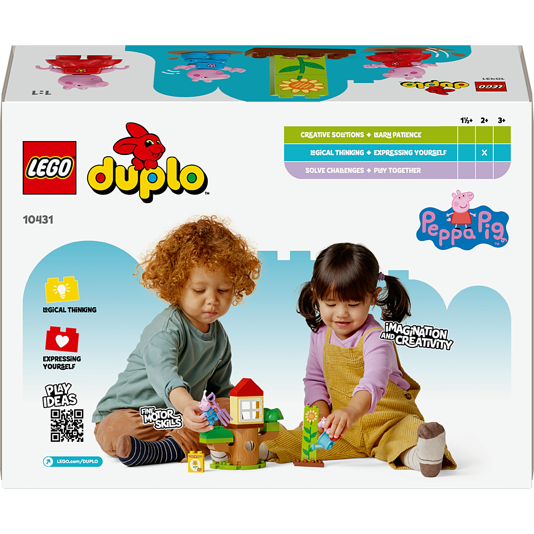 Invitez les tout-petits dès 2 ans à partir à l’aventure en plein air avec le set LEGO® DUPLO® Le jardin et la cabane dans l’arbre de Peppa Pig (10431). Filles et garçons assouvissent leur passion pour la nature en jouant à faire pousser un tournesol dans le jardin avec Peppa et George. Ce jouet à construire et reconstruire regorge d’accessoires pour inspirer les jeunes fans de Peppa Pig, dont un arrosoir et une fourche. Les tout-petits développent leur motricité fine et apprennent à trier et à associer des éléments en empilant les briques pour faire pousser la plante. Les 2 figurines peuvent ensuite jouer à cache-cache dans le tronc d’arbre ou se détendre dans la cabane dans l’arbre. Grâce à ce jouet d’éveil LEGO DUPLO Peppa Pig, les enfants d’âge préscolaire apprennent à résoudre des problèmes, à persévérer en faisant pousser la plante, à prendre soin de la nature et à s’exprimer en se mettant dans la peau des jardiniers Peppa et George.
