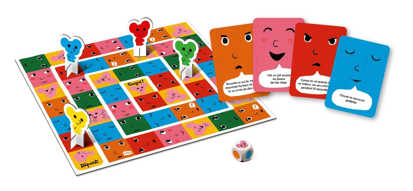 Assemblez les 9 pièces du plateau et faites 5 tas de cartes, 1 par couleur, face visage (sans texte). Les joueurs placent leurs pions « Souris » sur la case départ. Le plus jeune joueur commence et lance le dé. - Si le dé tombe sur une face couleur, il avance son pion sur la prochaine case de la même couleur. Il pioche la carte de la couleur correspondante et réalise l'action demandée. - Si le dé tombe sur la face « Souris », le joueur avance jusqu'à la prochaine carte « Souris défis » et réalise l'action demandée. Le premier arrivé sur la case de la souris au centre du plateau gagne la partie !