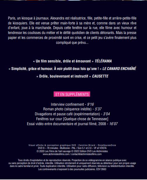 Paris, un kiosque à journaux. Alexandra est réalisatrice, fille, petite-fille et arrière-petite-fille de kiosquiers. Elle est venue prêter main-forte à sa mère et, comme dans un vieux rêve d'enfant, joue à la marchande. Depuis cette fenêtre sur la rue, elle filme avec humour et tendresse les coulisses du métier et le défilé quotidien de clients détonants. Mais la presse papier et les commerces de proximité sont en crise, et ce petit jeu s'avère finalement plus compliqué que prévu...