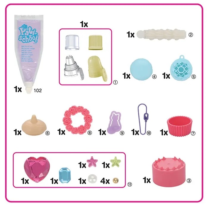 Un kit qui contient tout le nécessaire pour démarrer avec Pati-school. Réalisez une boite, un porte photo et un porte-clés en formes de jolis gateaux ! Munissez vous de la poche à douille remplie de pâte modelable, et décorez les bases solides. Placez les décorations selon vos envies, et laissez sécher ! Dès 6 ans.
